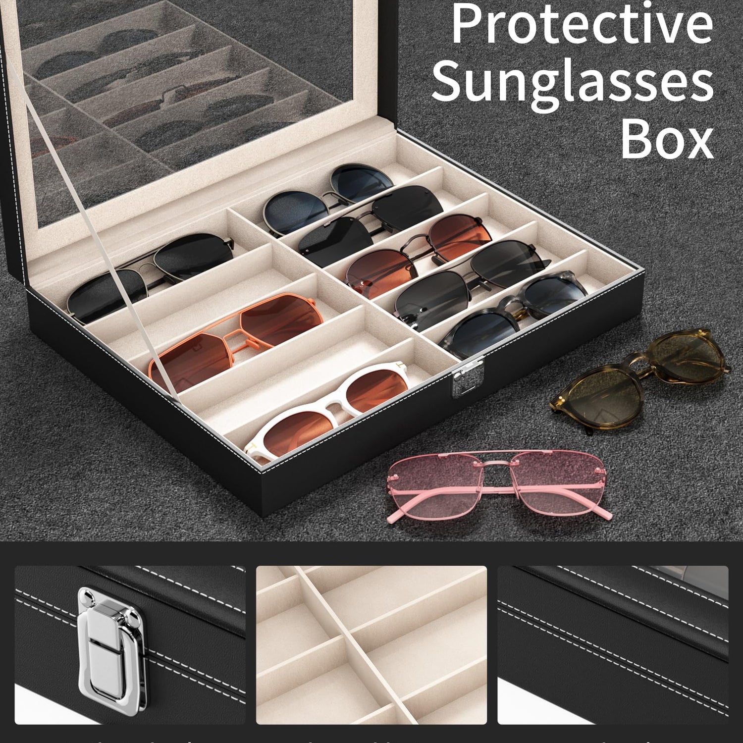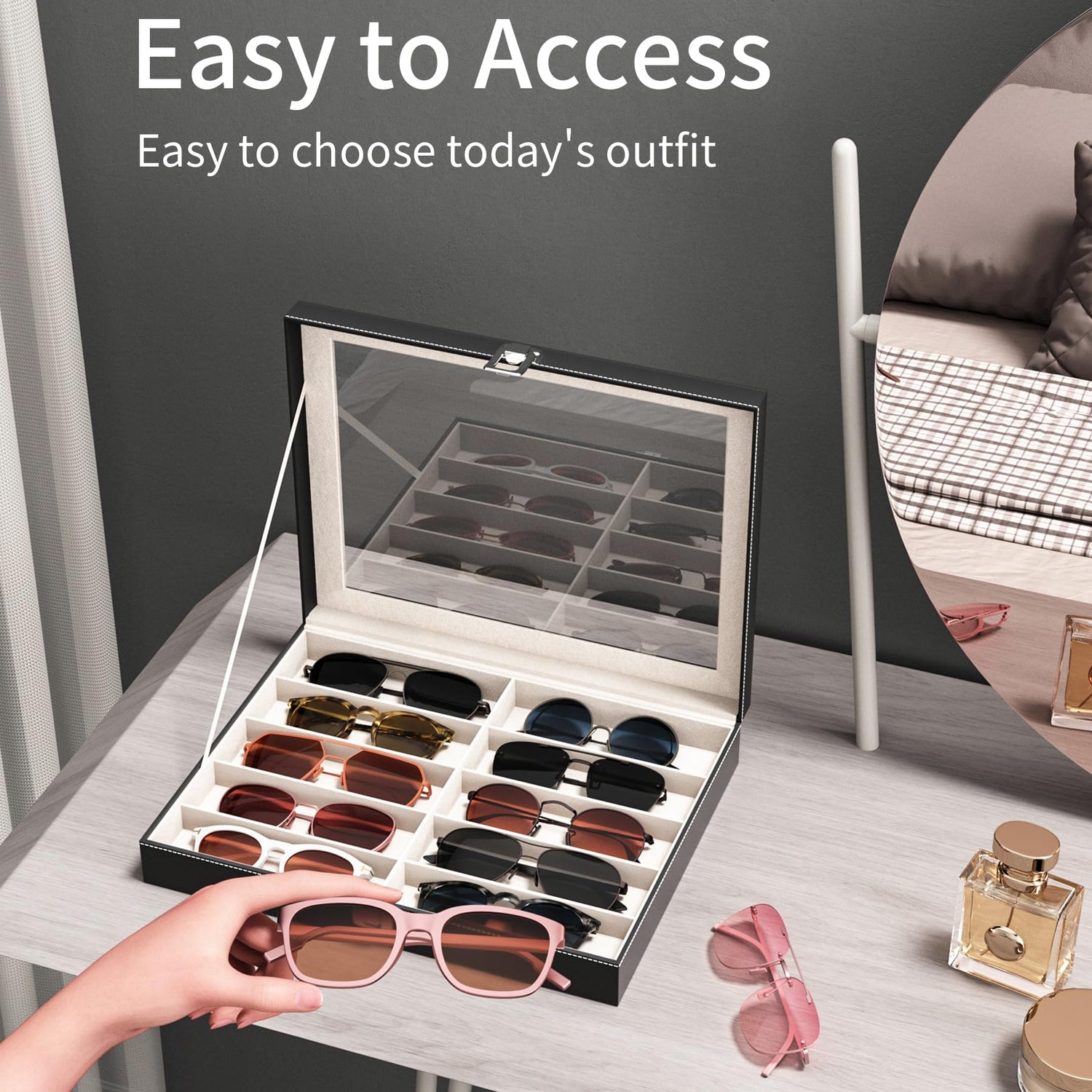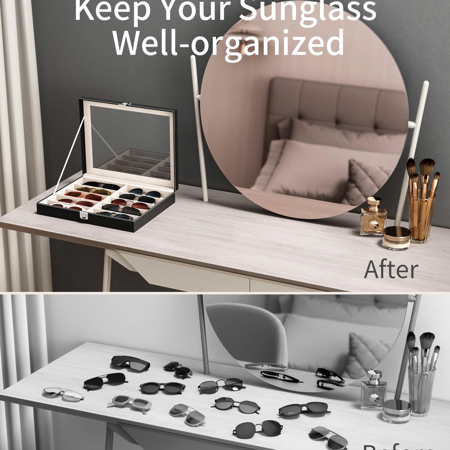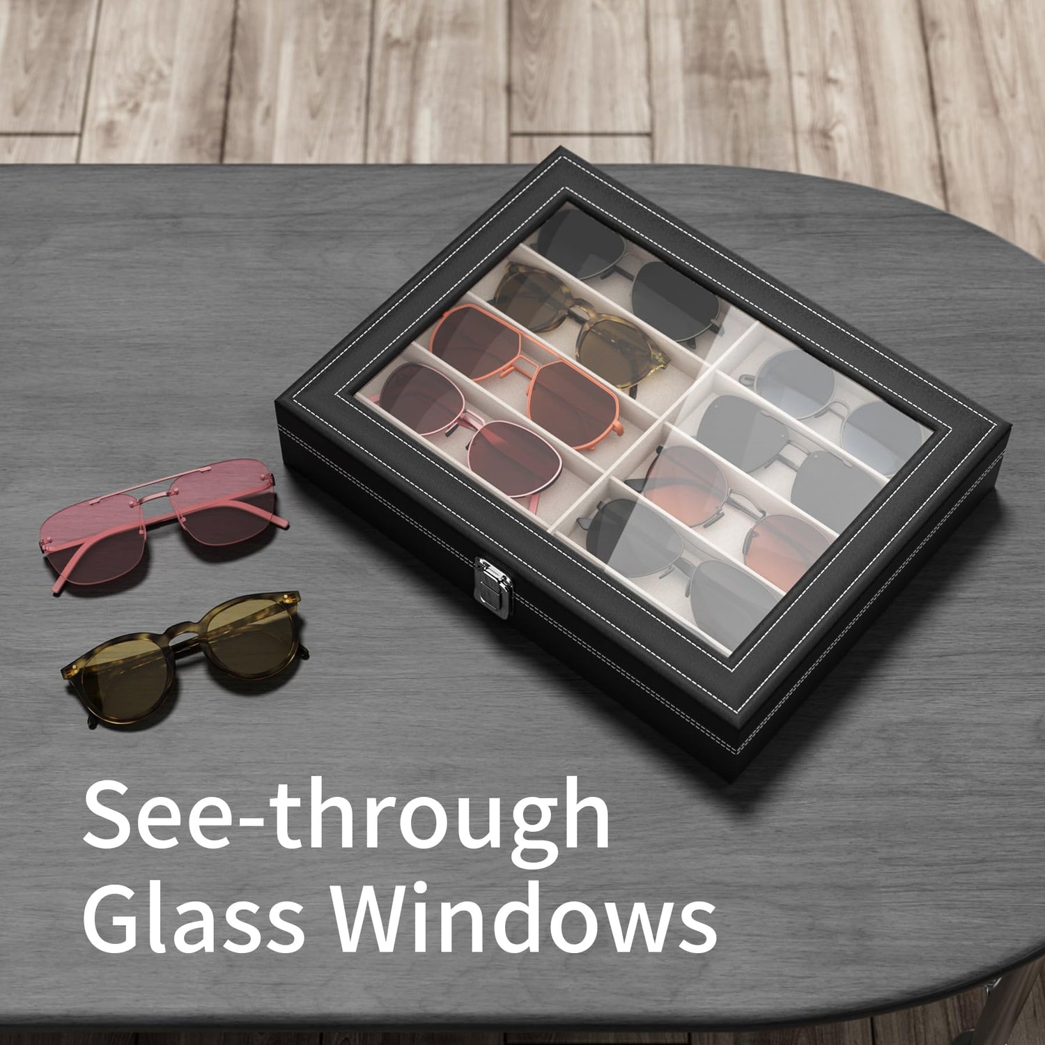- SEE-THROUGH DISPLAY CASE - The anti-scratch glass top not only does it display the sunglasses you’ve collected, but it also helps you quickly find the pair you want at a glance, saving time and making it easy to match with your outfit of the day