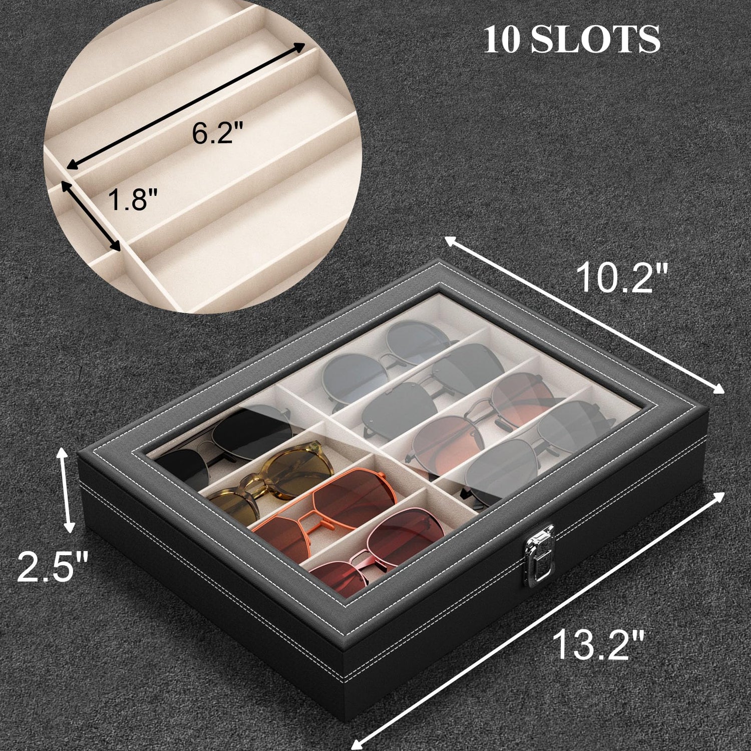 NEWLOOP Sunglass Organizer for Women Men - Multiple Pair of Sunglasses Storage Box Eye Glass Watch Leather Display Case with 10 Slots Black