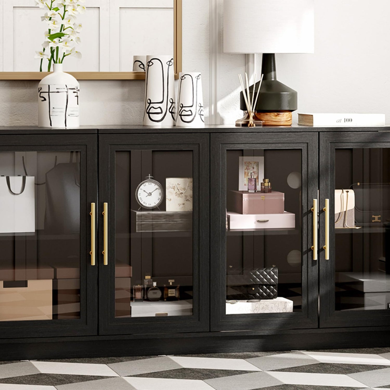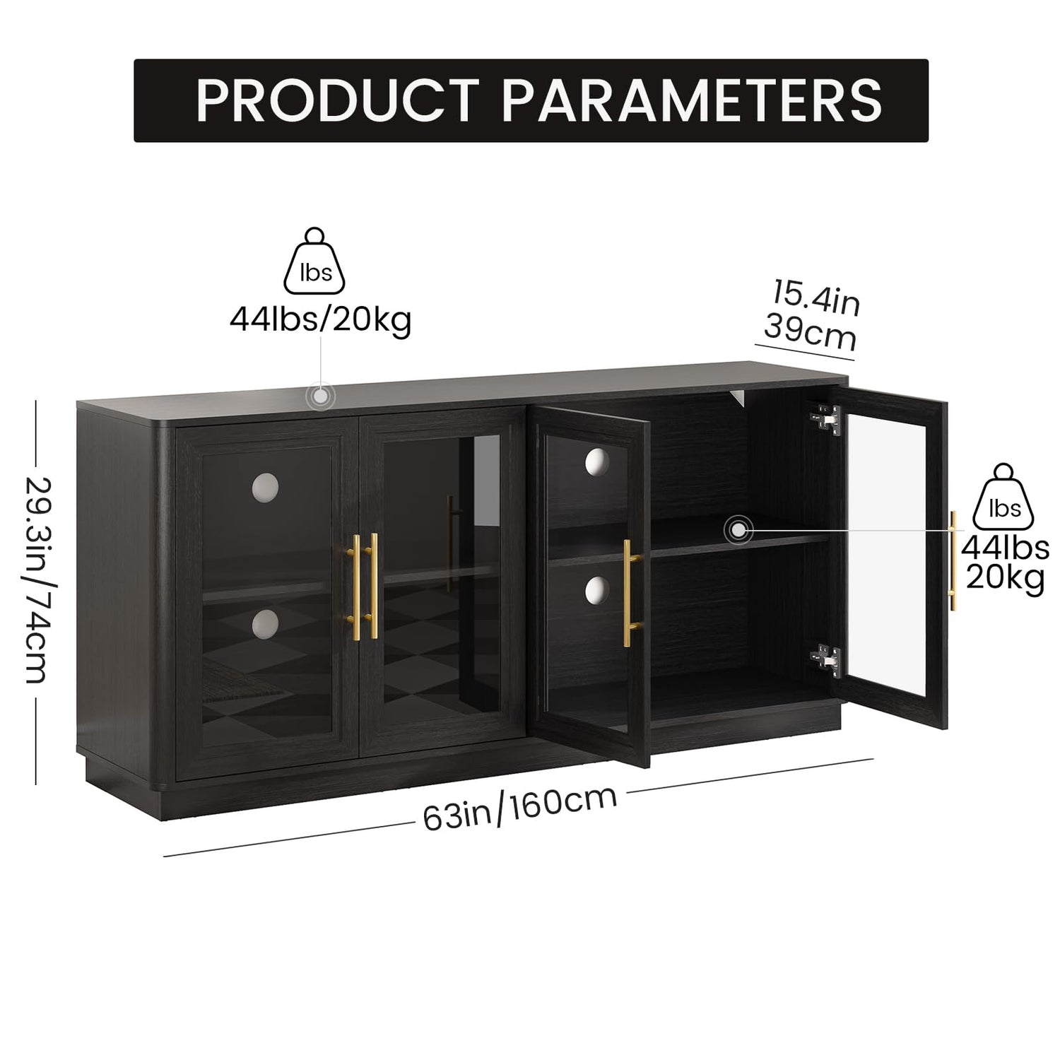 NEWOWNDS Buffet Cabinet with Storage,63" Large Sideboard Buffet Cabinet,Modern Sideboard Kitchen Cabinet with 4 Transparent Glass Doors,Credenza Coffee Bar Cabinet Buffet Table for Kitchen,Black