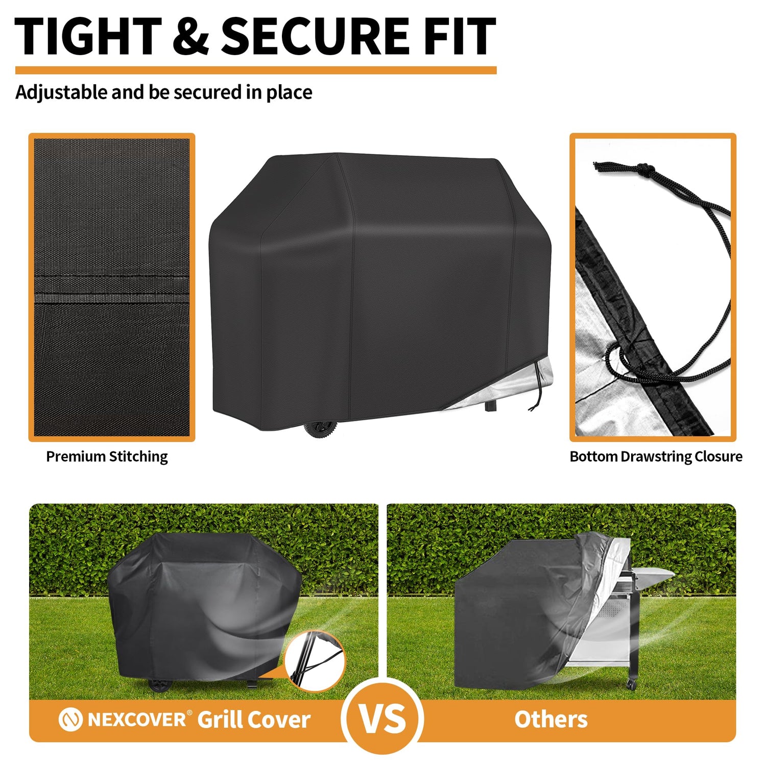 - 【Adjustable Hem Drawstring】: This gas grill cover is equipped with an adjustable hem drawstring. This feature allows you to tailor the cover to your grill, and effectively protect your grill cover from being blown away by the wind, providing a secure and customized fit. Simply utilize the adjustable drawstring to wrap around your grill, ensuring a snug and protective barrier against the elements.