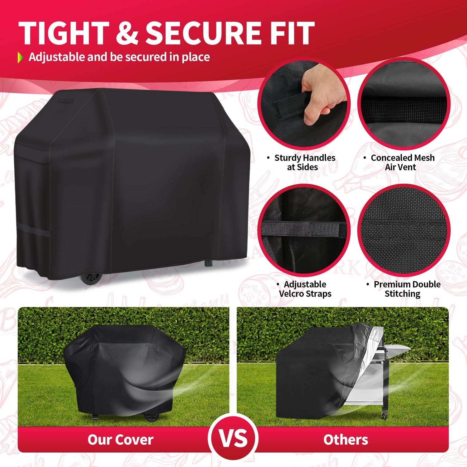 - 【Handles & Straps & Covered Air Vents】: The upgraded grill cover is designed with concealed air vent, 2 handles and adjustable 2 straps. Concealed air vent design can keep your grill dry well. Handles and straps is convenient to hold the grill and grill cover tightly together - Prevent your cover from blowing off.
