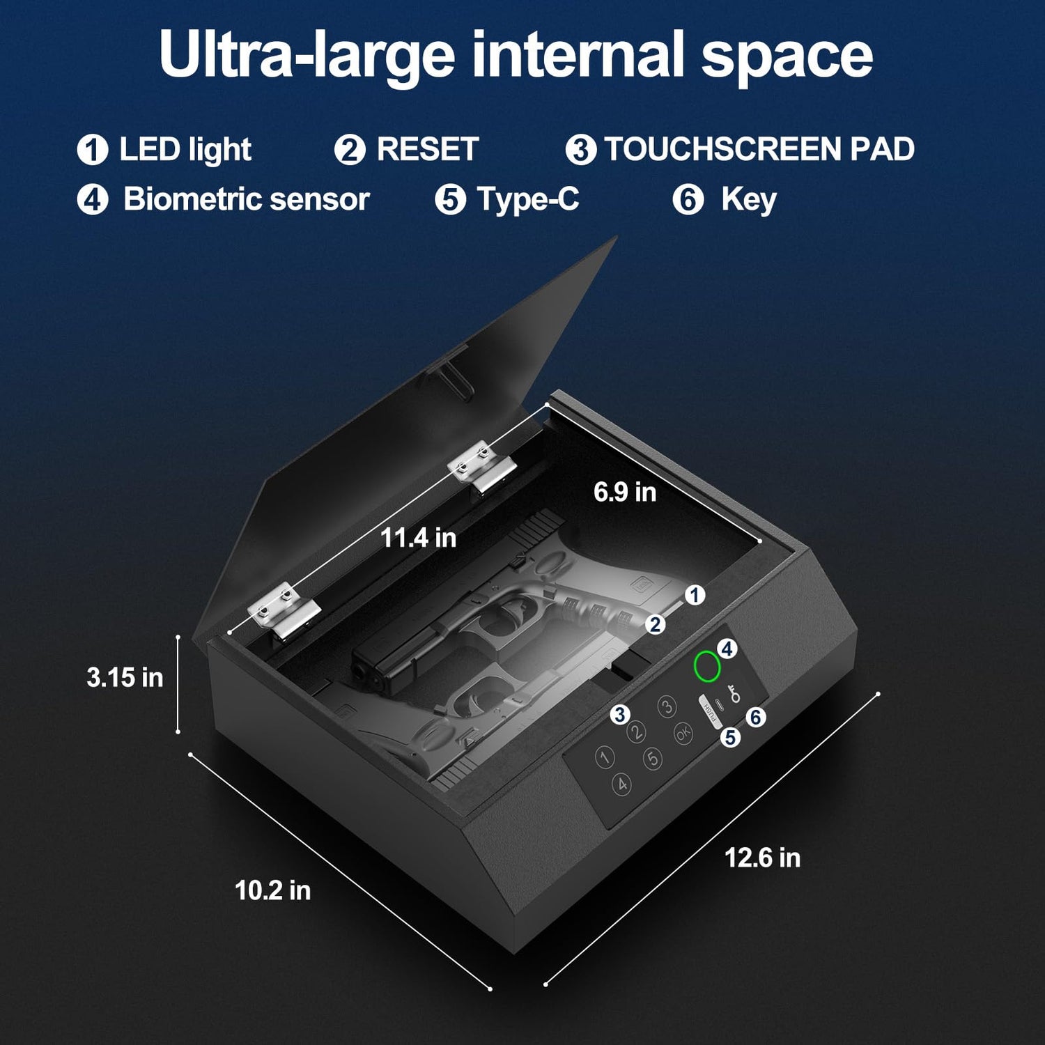 • 【3 Fast Unlock Methods】Our small safe can be quickly accessed via fingerprint, PIN, and key. High-resolution fingerprint scanning and self-learning technology unlock a pistol safe with one hand in 1s. Numeric keys 1-5 diversify passwords and enhance security. 3-unlocking options provide flexible and quick access to the pistol safe, saving time and ensuring safety in times of danger
