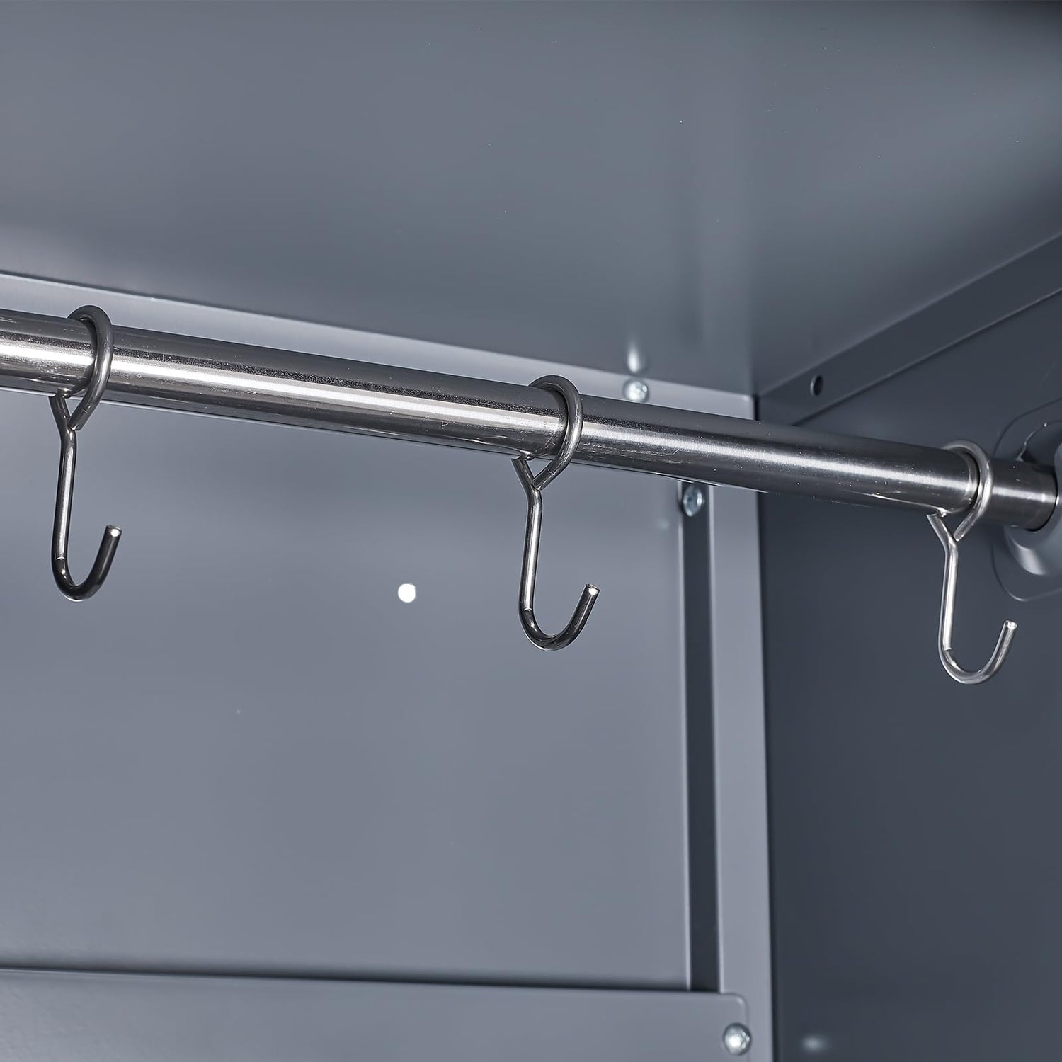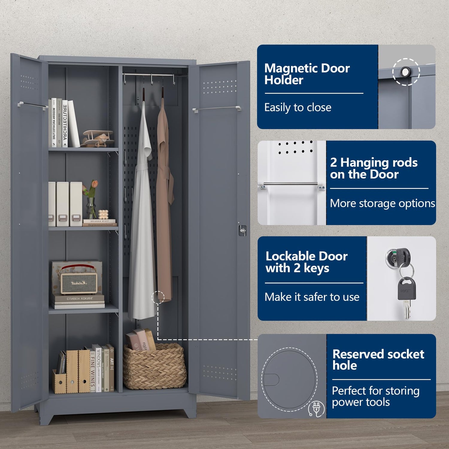 - 【Ample Storage Space】This metal storage cabinet dimension 72.8H*31.5W*15.7D, has 4 adjustable shelves on the left side, and the 4 shelves in the middle can be removed disassembly, and adjusted according to your actual needs. The right side is equipped with a hanging rod, S-shaped hooks, and a tool pegboard to hang clothes backpacks, and various tools. The boom on the door can be used to hang towels and other items.