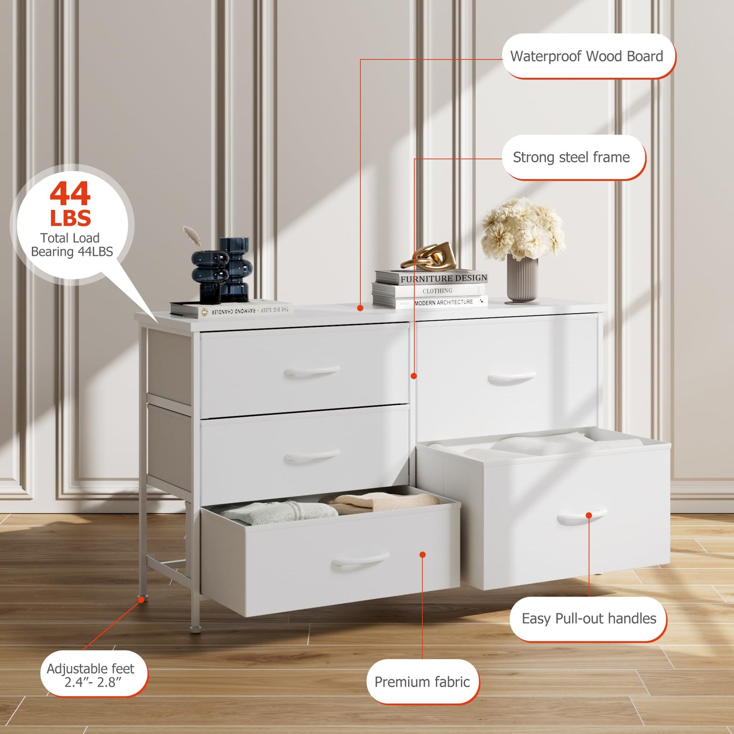 Nicehill White Dresser for Bedroom with 5 Drawers, Small Dresser for Kids' Bedroom, Closet, Wide Chest of Drawers with Storage Drawers, Wooden Top, Steel Frame, Modern, White
