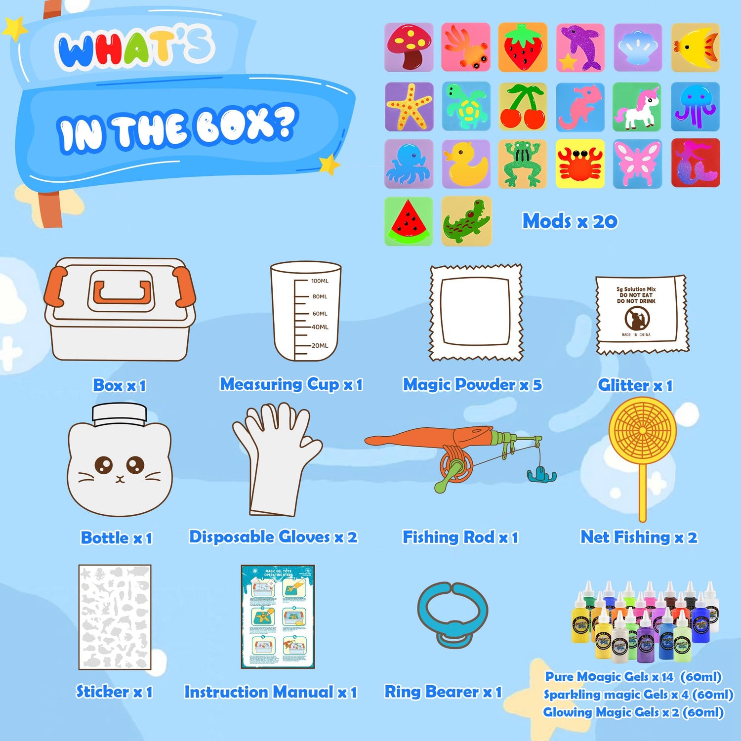 - DIY Squishy Making Kit: Place the colorful gel into the molds, immerse them in a special solution, and watch them come to life! With innovative design offering multiple play options, you can enjoy the double fun of aqua fairy, fishing, and noodle squeezing—double the joy! Then, store your aquatic pets in the included "storage bottle" for hours of creative fun.