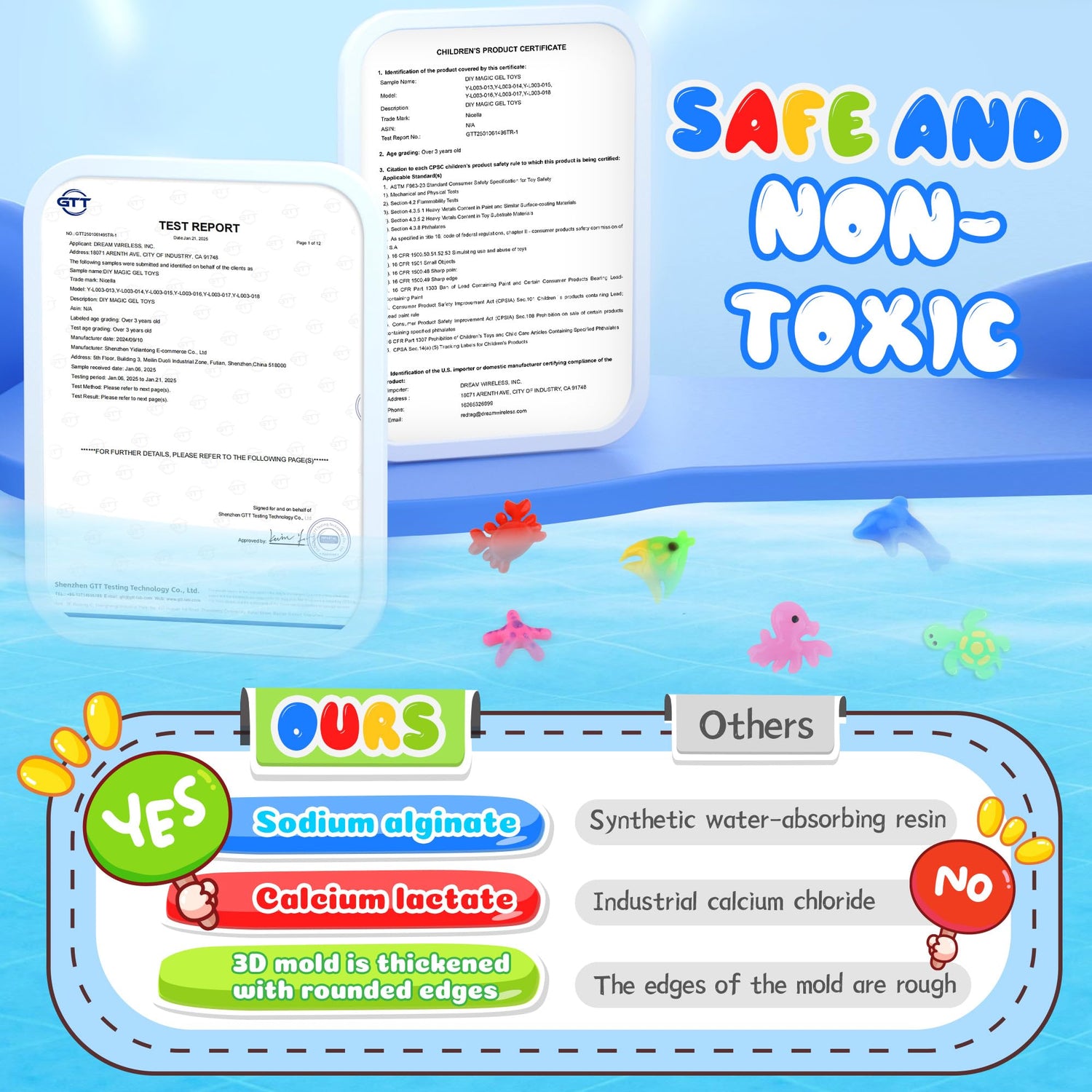 - Premium Quality and Safety:This magic water elf toy kit is environmentally friendly and non-toxic, ensuring that children can enjoy DIY fun with peace of mind. The colorful bottles are soft enough for little hands to squeeze. The edges of the molds are smooth. The magic gel is made from a substance extracted from natural seaweed, and the magic powder is food-grade calcium lactate. All materials have passed rigorous testing in international laboratories.
