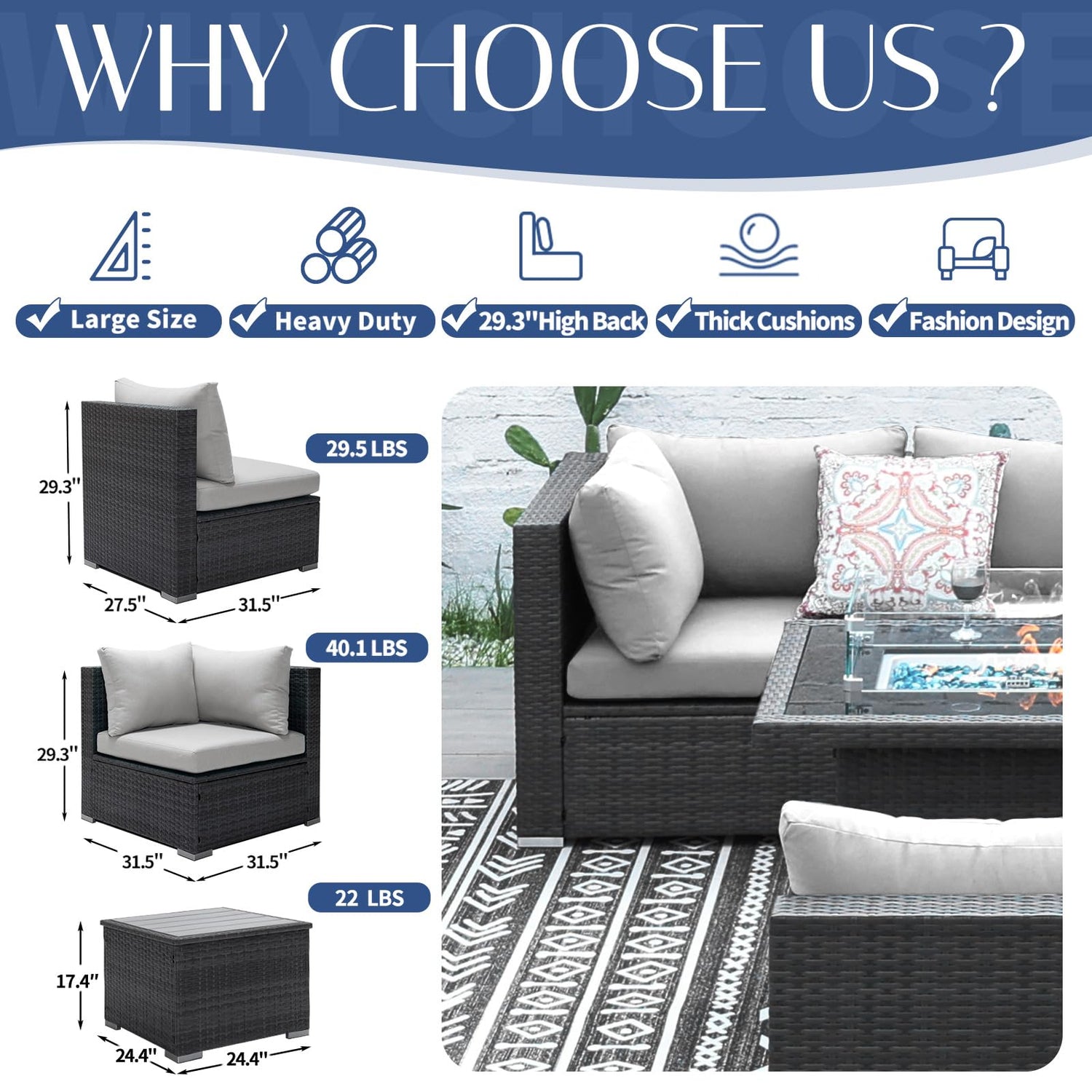 - 【29.3'' High Back Design】Our outdoor sofa set, featuring a high back design with dimension of 29.3'', is customized for ultimate relaxation. Its modular components can fit your preferred arrangement and blend seamlessly into your backyard. The thickened seat and back cushions guarantee excellent support and unparalleled comfort, perfect for leisurely garden afternoons. The high back adds extra support, making every moment a therapeutic retreat.