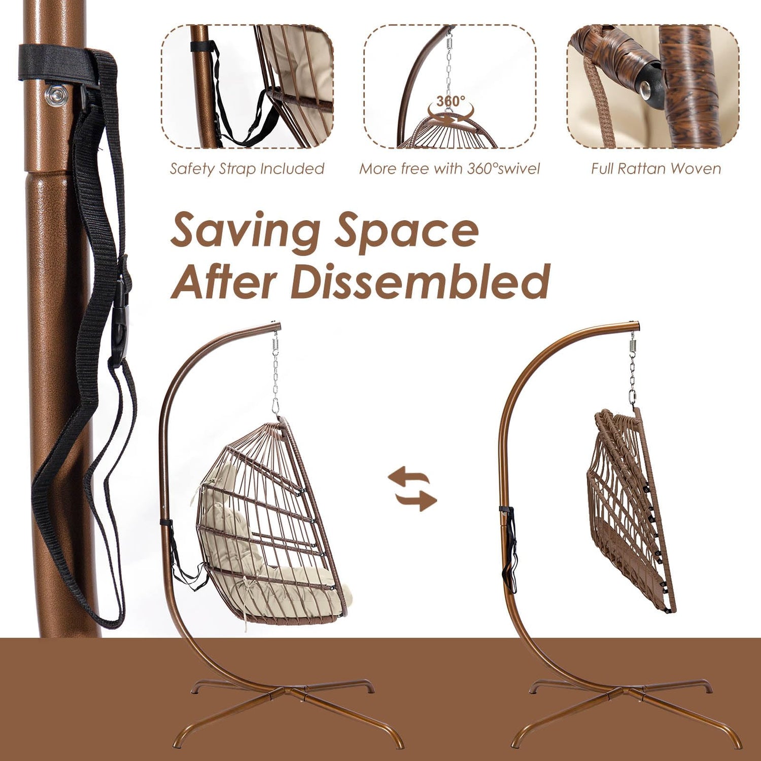 - EASY TO ASSEMBLE DISASSEMBLE: This one-person chair can be folded and the stand frame is simple to fix together with the included tools and accessories; Everything you need is in one box, including the basket, headrest pillow, seat cushion, safety strap, and stand; Safety strap helps keep the chair safely in place while getting in and out of the chair