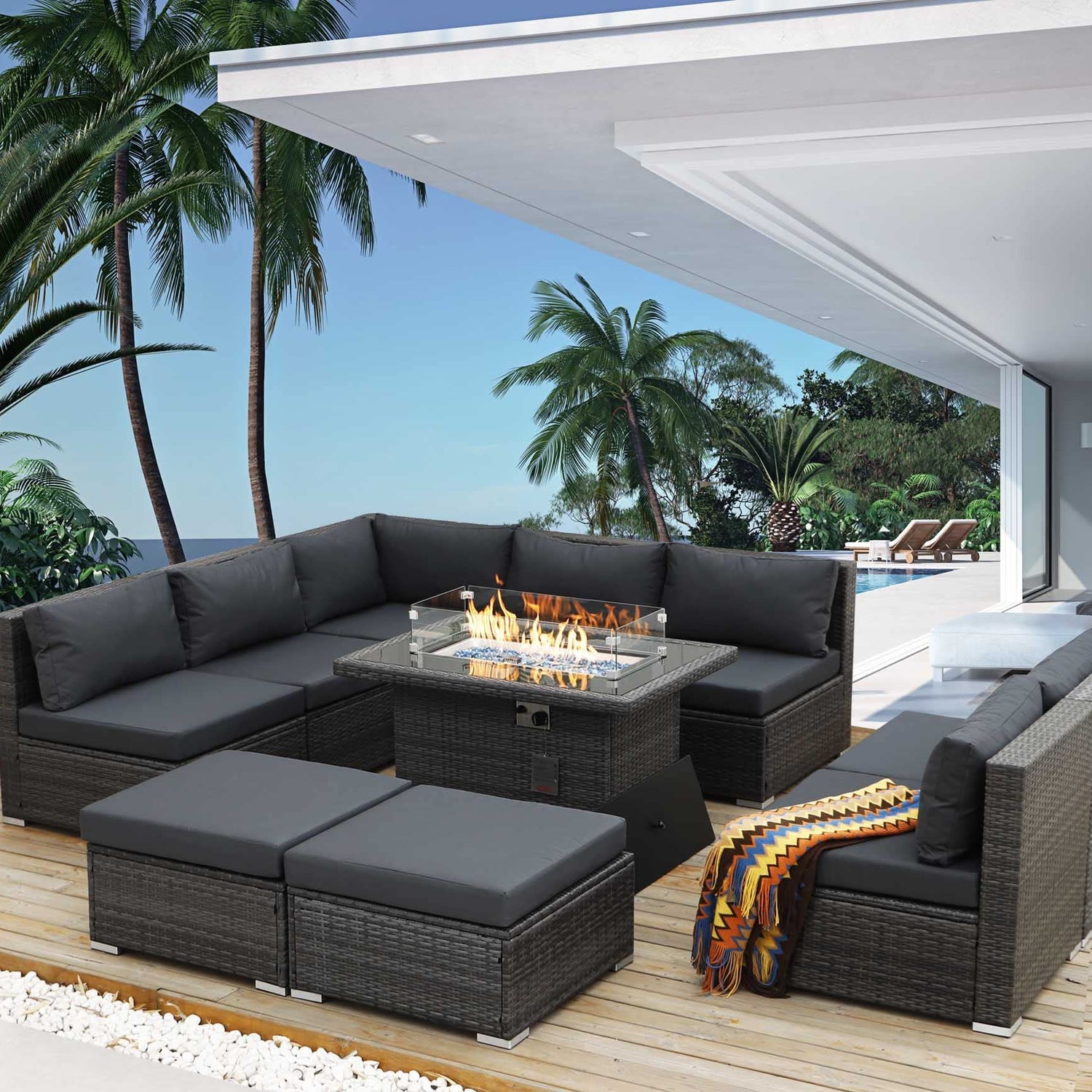 - SET INCLUDED: This elegant 10 Pieces modern luxury patio sofa set in grey colors with 9 seatings includes one fire pit table, one corner seat, six middle seats, and two ottomans; in addition, we also put one pc of table cover, one set wind guard, and 18 lbs glass beads in the fire table box