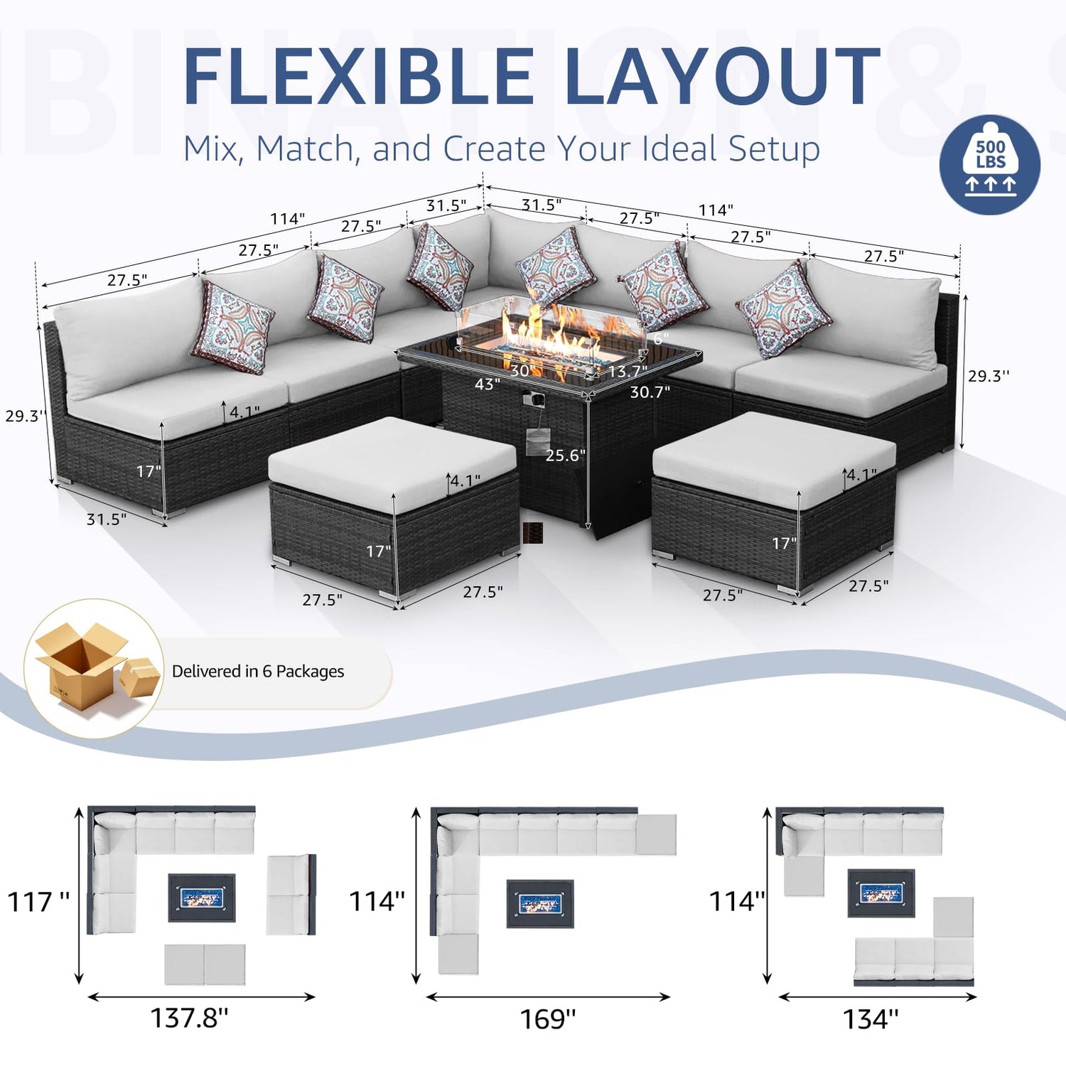 - SET INCLUDED: This 10 pcs high-quality best rated gray sofa set with fire pit Includes one fire pit table, one corner chair, six armless chairs, two ottomans, 1 set of wind-guard, and 18lbs blue color glass beads for decorating the burner pan; these modular pcs can be arranged to be placed at your preference