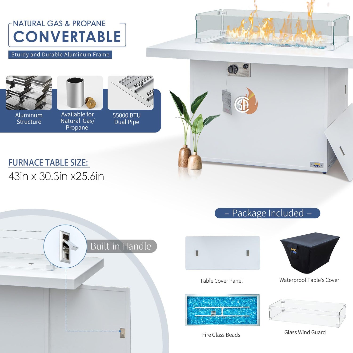 - Dual-Fuel Fire Table: The matched aluminum fire pit table is whole set CSA certification to guarantee a safe use; It equipped with stainless steel pan and H pipes burner to provid up to 60,000 BTU heat output and ample warmth, the ignition device and electronic switch control could ensure an easy adjustment of flame; The fireplace table can be converted from propane to natural gas with the orifice we provided