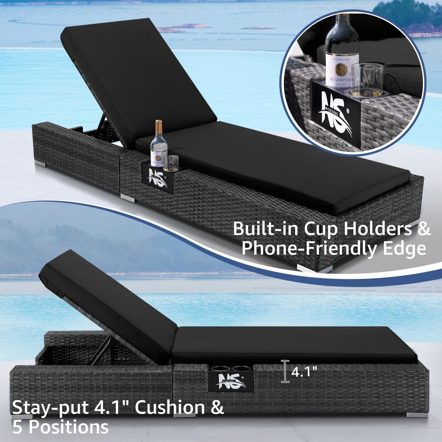 - BUILT-IN CUP HOLDERS LOUNGE CHAIRS: Our chaise loungers offer the perfect relaxation experience with spacious dimensions of 76.7" long and 22.4" wide; Unlike typical recliners, the thick 4.1" cushions keep you comfortable while sunbathing or tanning for long periods without overheating; With five adjustable positions, you can easily find your ideal angle; Plus, each chair features two built-in cup holders for your favorite beverages, making your outdoor experience both delightful and convenient