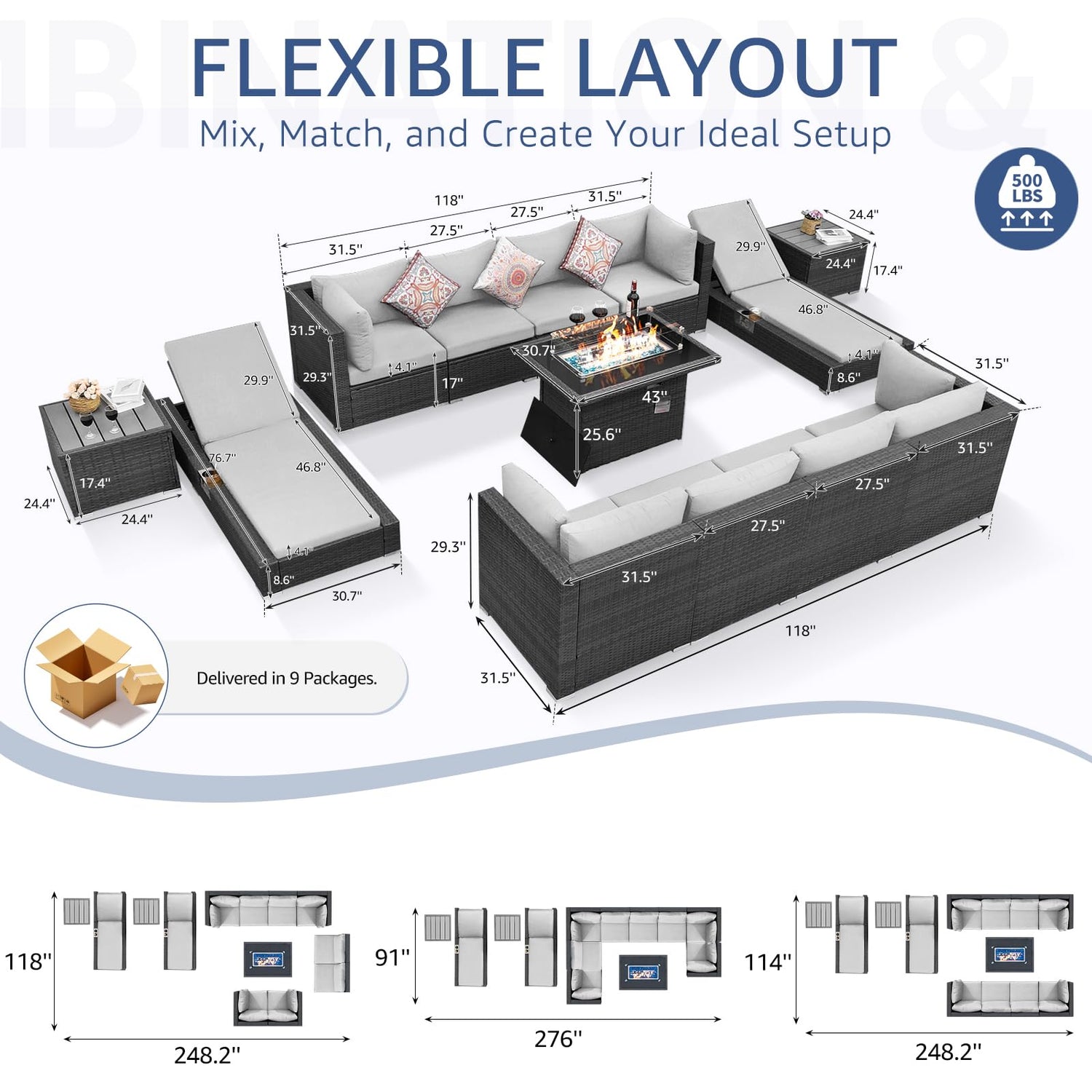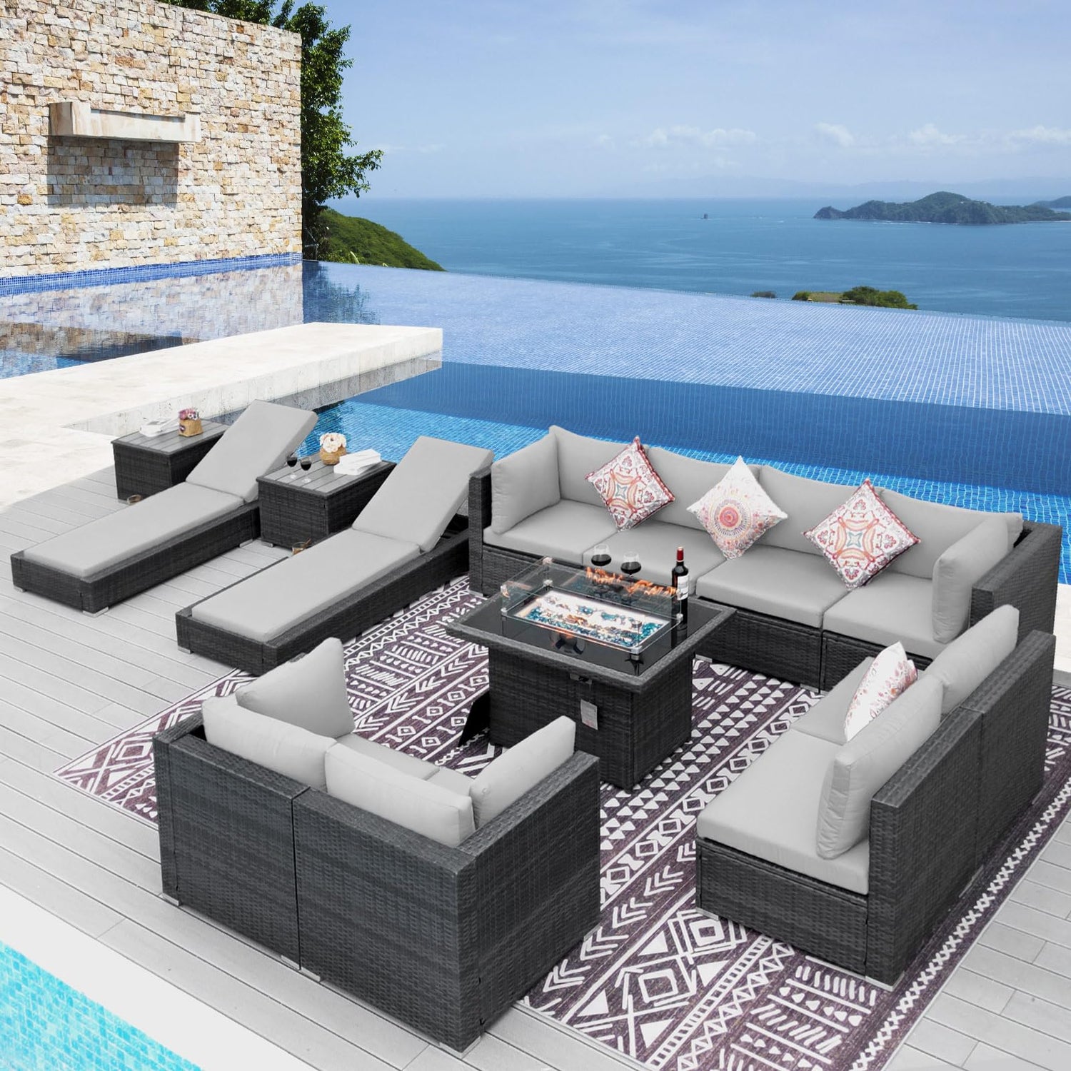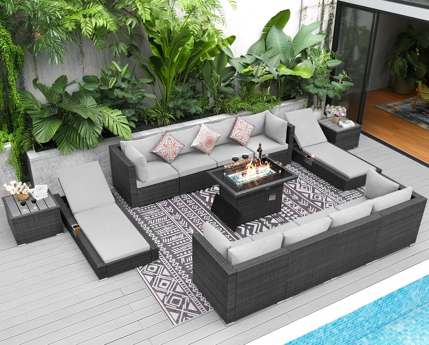 NICESOUL 13 Piece Outdoor Seating with Fire Pit Table, High-End Wicker Patio Furniture Set with Chaise Lounge, Comfy 29.3'' High Back Deep Sectional Sofa, All-Weather Backyard Sitting Area, Light Grey