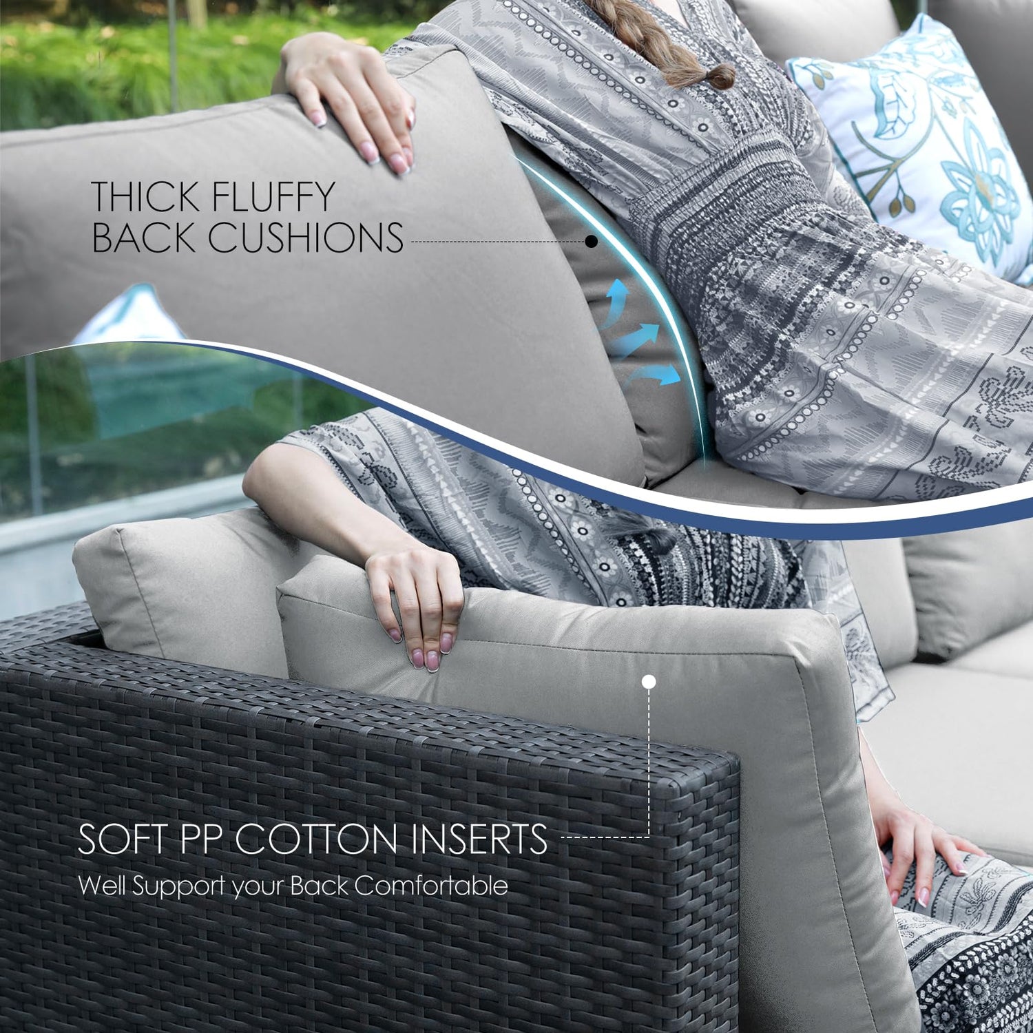 - 4.1" THICK CUSHIONS: Unlike other brands with 3-inch cushions, our high-end outdoor seating features thick 4.1-inch cushions that resist sagging; Each cushion is equipped with an anti-slip pad, ensuring they stay in place; The plush pillow-style backrests are generously filled with strong supportive PP cotton for ultimate comfort, allowing you to unwind in style