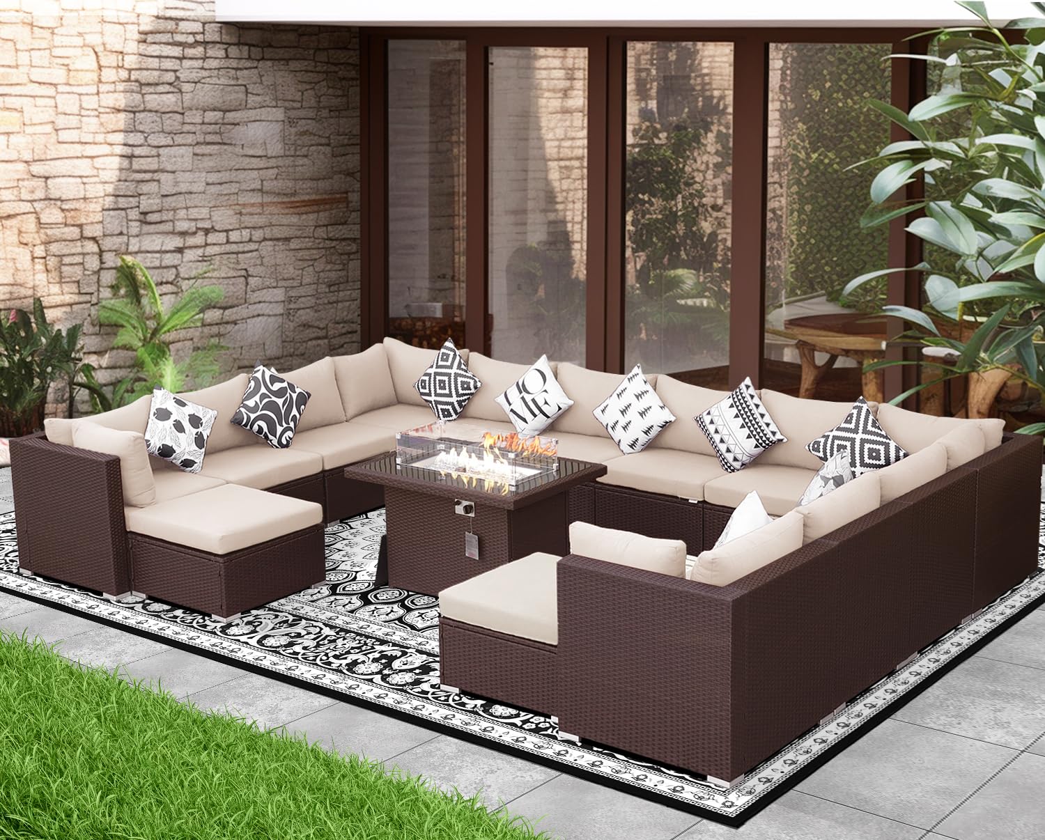 NICESOUL 15 Piece Outdoor Sectional with Fire Pit Table, Modern Luxury Patio Deep Seating w/Firepit, 29.3'' High-Back Wicker Couch Thick, Big High-Weight Capacity Sofa for Garden, Yard, Brown & Beige