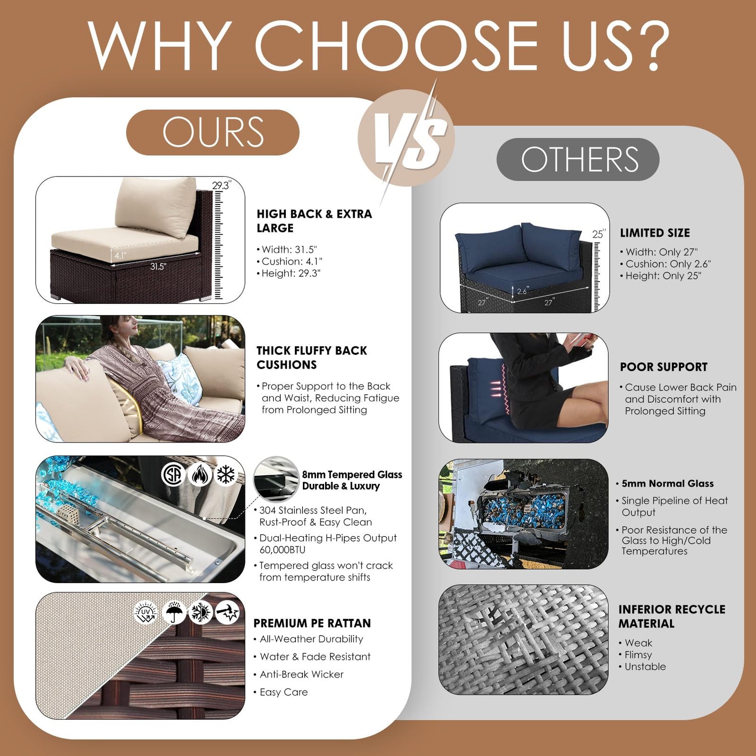 - 4.1" THICK CUSHIONS: Unlike other brands with 3-inch cushions, our high-end outdoor seating features thick 4.1-inch cushions that resist sagging; Each cushion is equipped with an anti-slip pad, ensuring they stay in place; The plush pillow-style backrests are generously filled with strong supportive PP cotton for ultimate comfort, allowing you to unwind in style