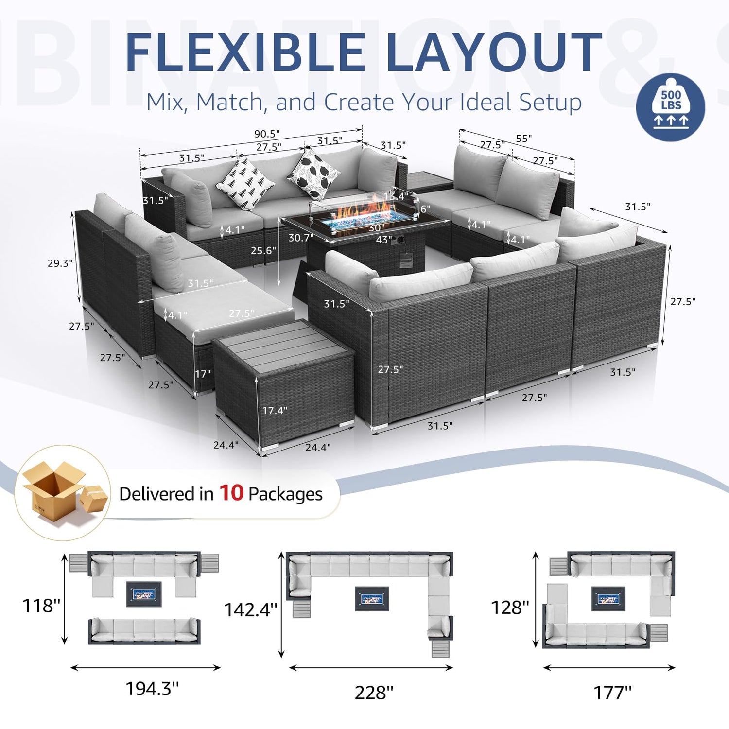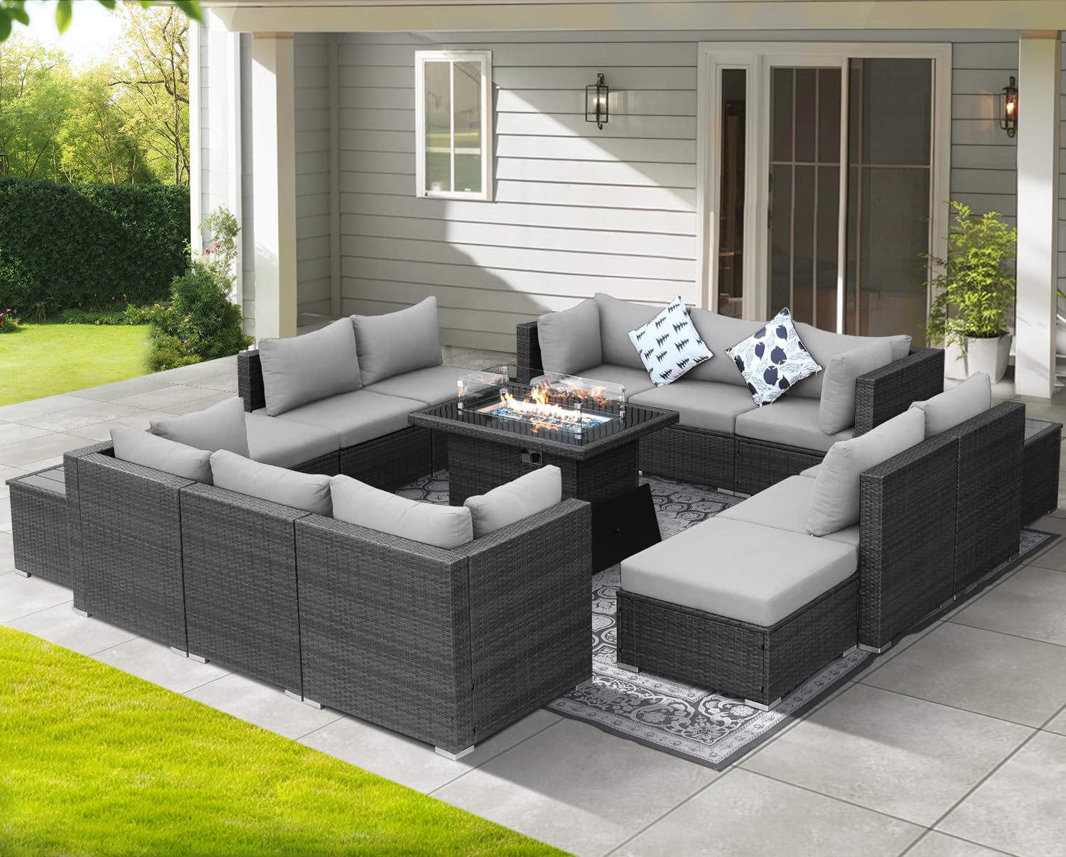 - SET INCLUDED: This 15 pieces elegant grey rattan conversation set includes one fireplace table, four coner chairs, six armless chairs, two ottomans, two side tables; The cushion covers are designed with removable zipper for easy changing; These modular pieces can be organized at your preference