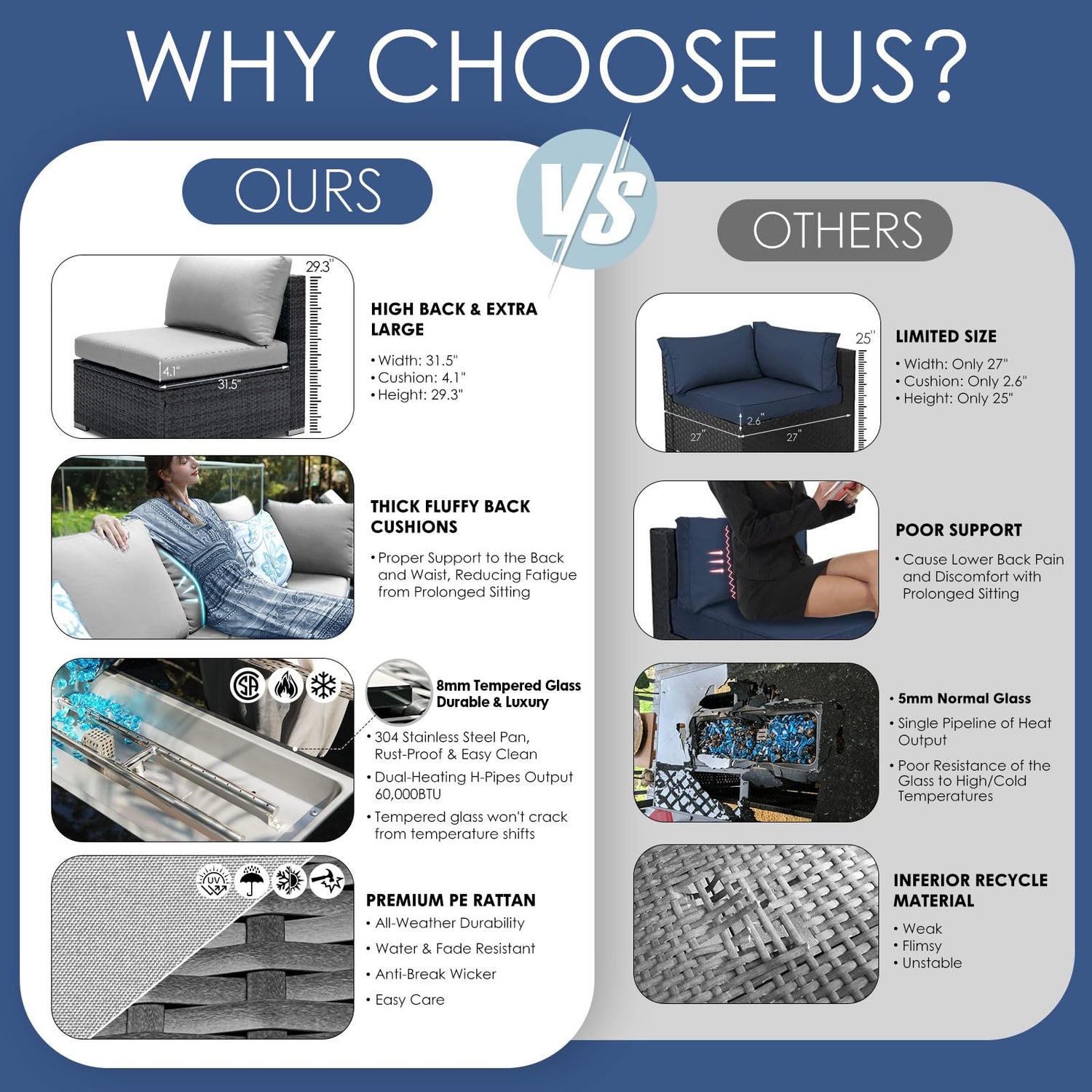 - 4.1" THICK CUSHIONS: Unlike other brands with 3-inch cushions, our high-end outdoor seating features thick 4.1-inch cushions that resist sagging; Each cushion is equipped with an anti-slip pad, ensuring they stay in place; The plush pillow-style backrests are generously filled with strong supportive PP cotton for ultimate comfort, allowing you to unwind in style