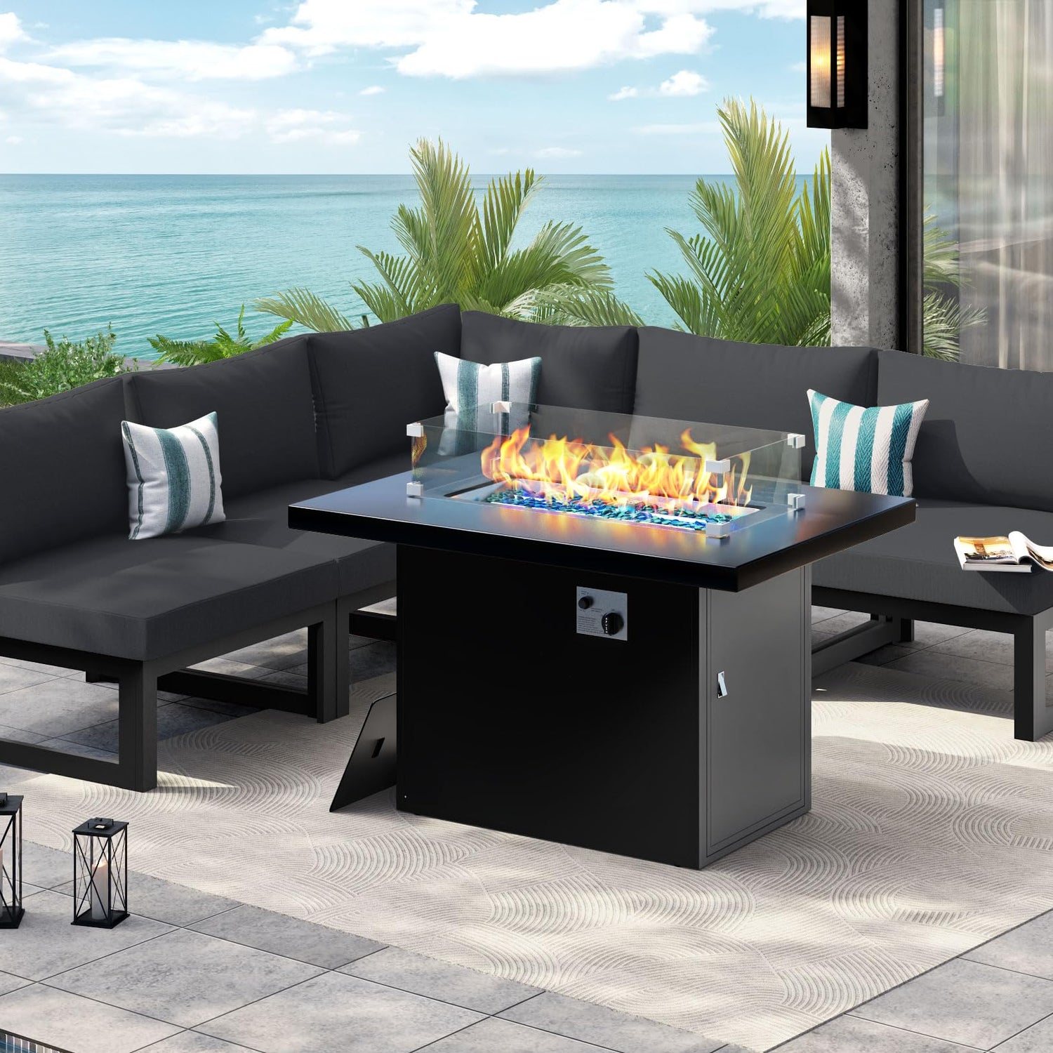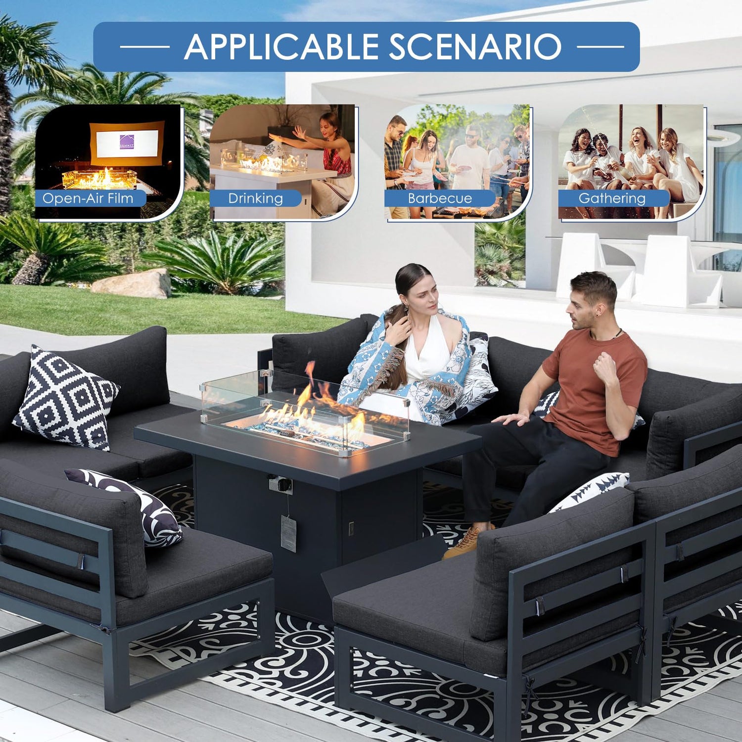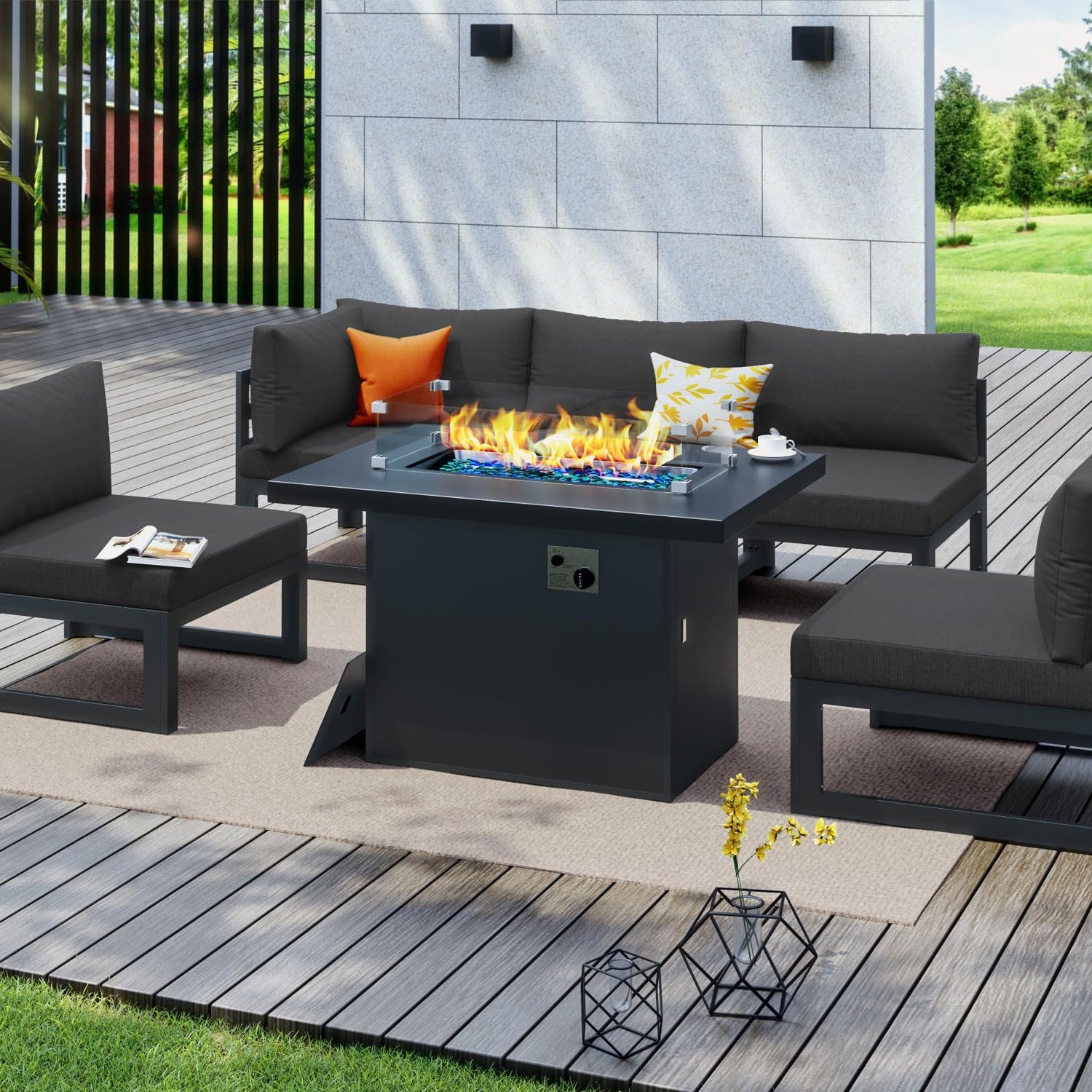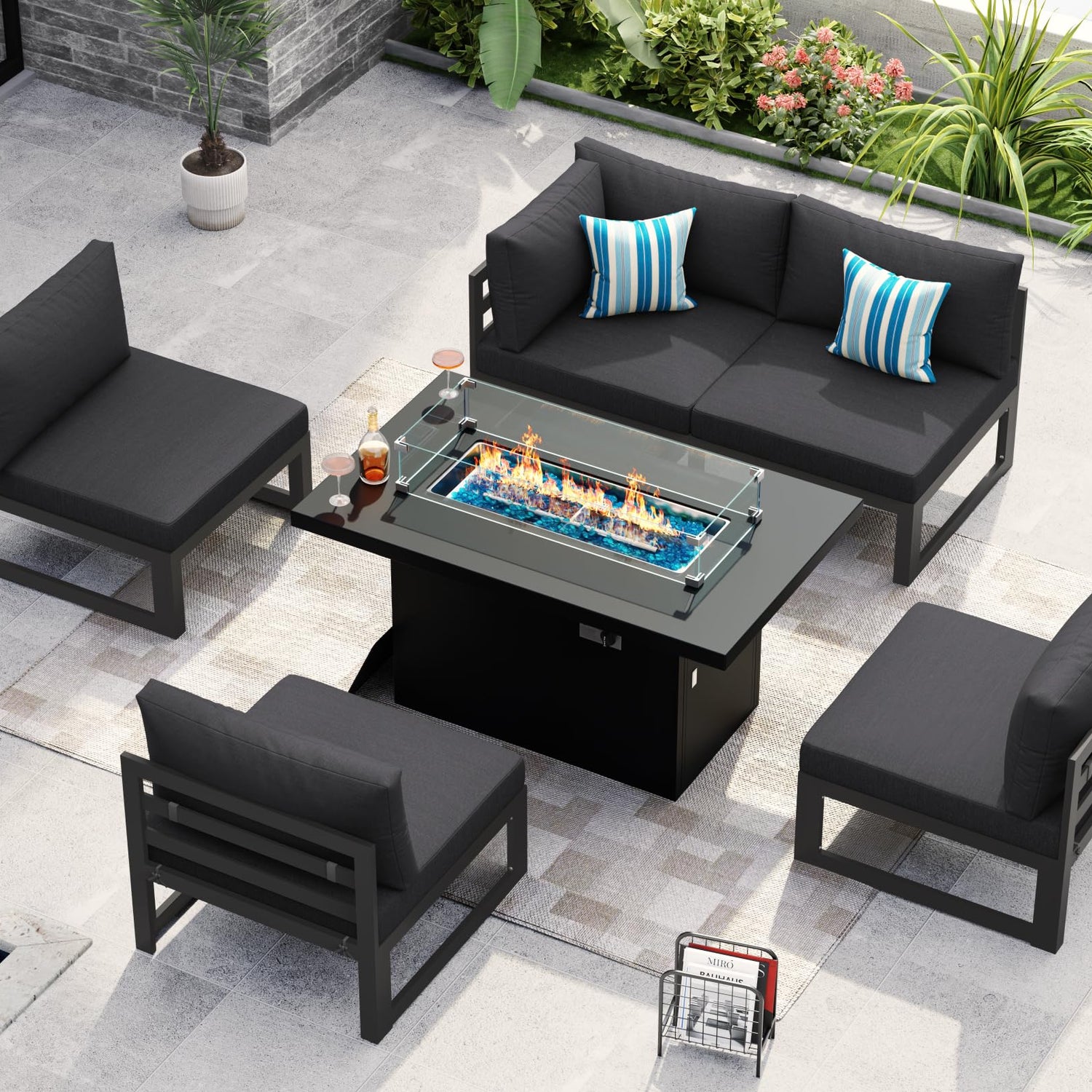 - Set Includes: This modern six pieces of sectionals includes one fire pit table, four armless chairs, and one chair, in addition, we also put one pc of table cover, one set wind guard, and 18 lbs glass beads in the fire table box; These modular pieces can be organized at your preference