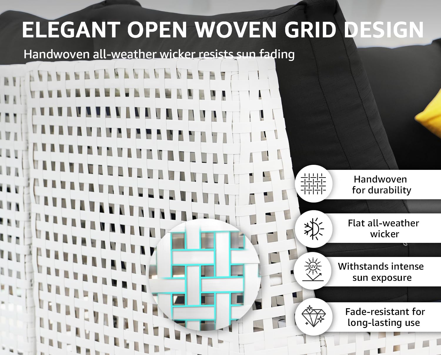 - Modern Geometric Design: The contemporary open woven grid structure outdoor sectional sofa collection reinterprets classic wicker through 3D geometric patterns, creating mesmerizing shadow interplay; 20cm stainless steel legs with mirror-polished surfaces amplify spatial openness through reflective lightness; The hand-woven pearl grey rattan shimmers for a sophisticated feel; Elevate your living space with 5 water-resistant cushion color options that adapt to surroundings
