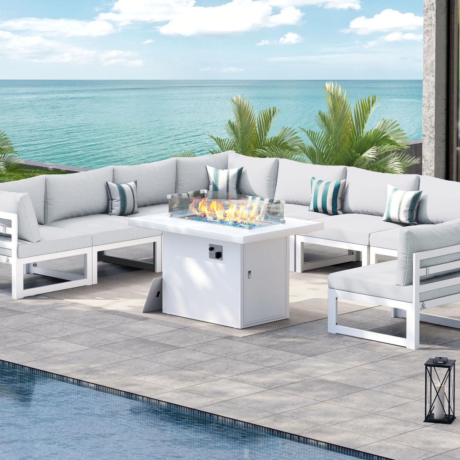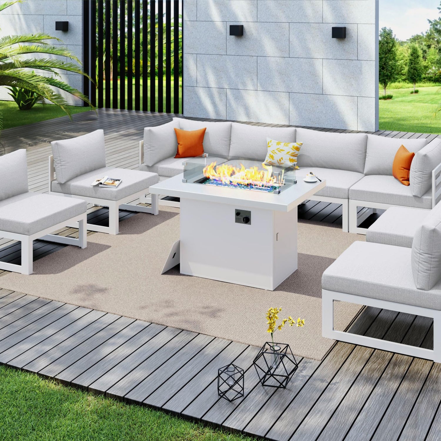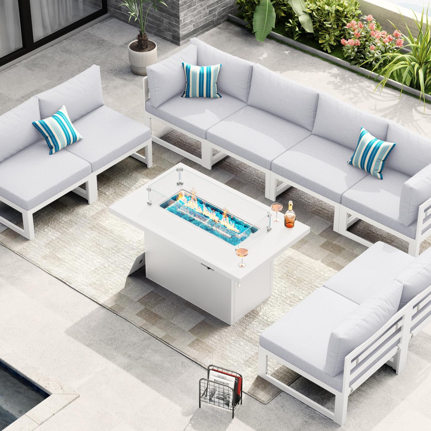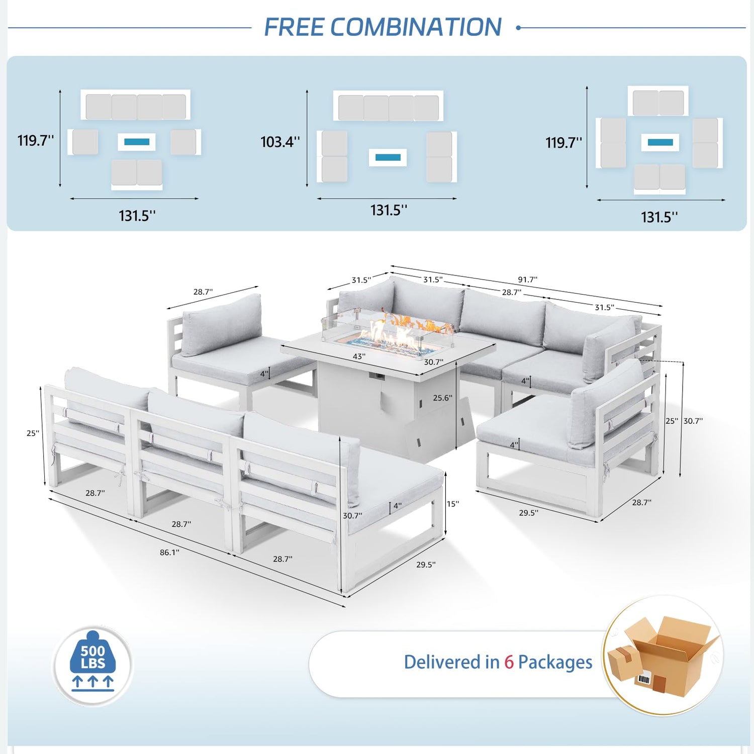 - Set Includes: This modern nine pieces of sectionals includes one fire pit table, six armless chairs, and two corner chairs, in addition, we also put one pc of table cover, one set wind guard, and 18 lbs glass beads in the fire table box; These modular pieces can be organized at your preference