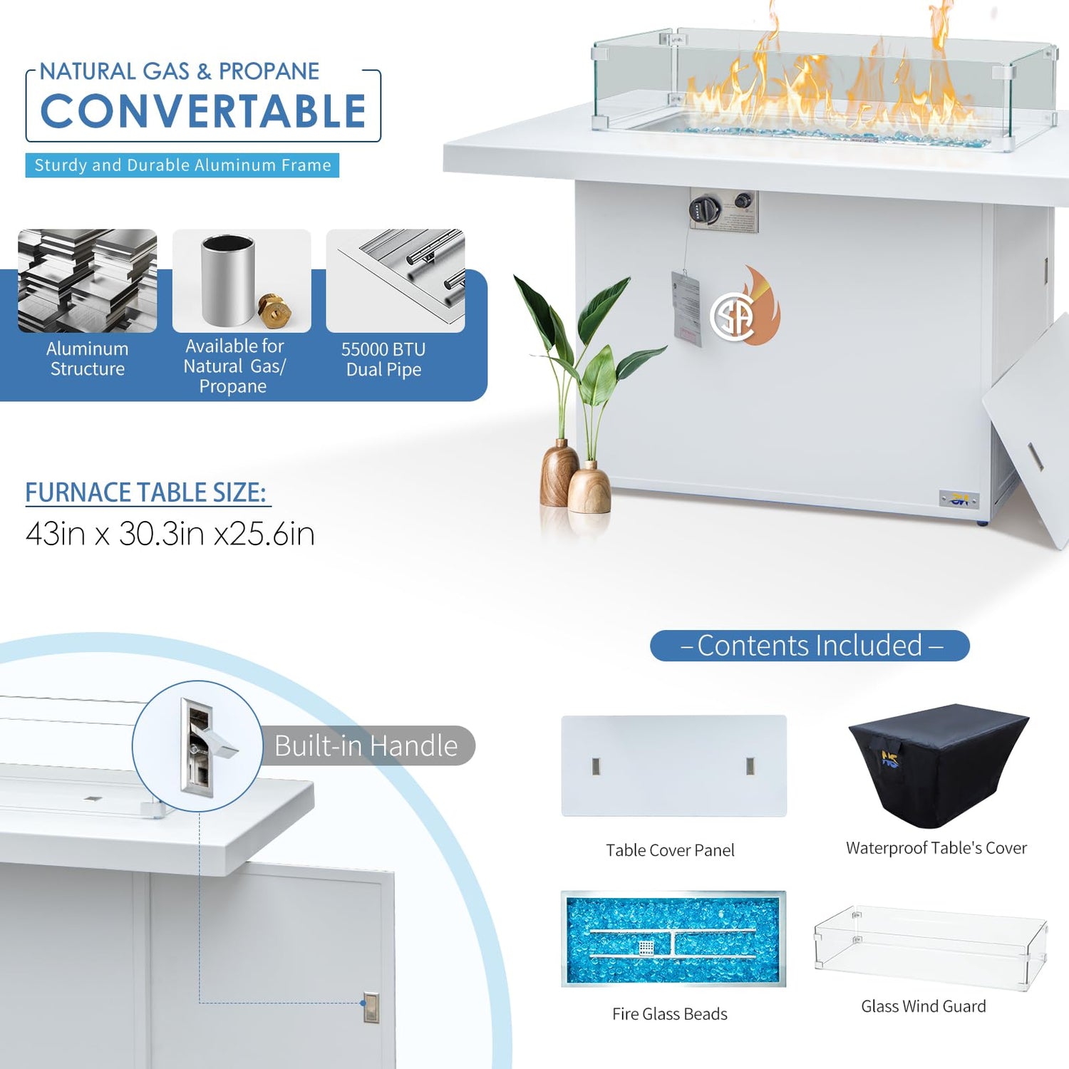 - Dual-Fuel Fire Table: The matched aluminum fire pit table is whole set CSA certification to guarantee a safe use; It equipped with stainless steel pan and H pipes burner to provid up to 60,000 BTU heat output and ample warmth, the ignition device and electronic switch control could ensure an easy adjustment of flame; The fireplace table can be converted from propane to natural gas with the orifice we provided