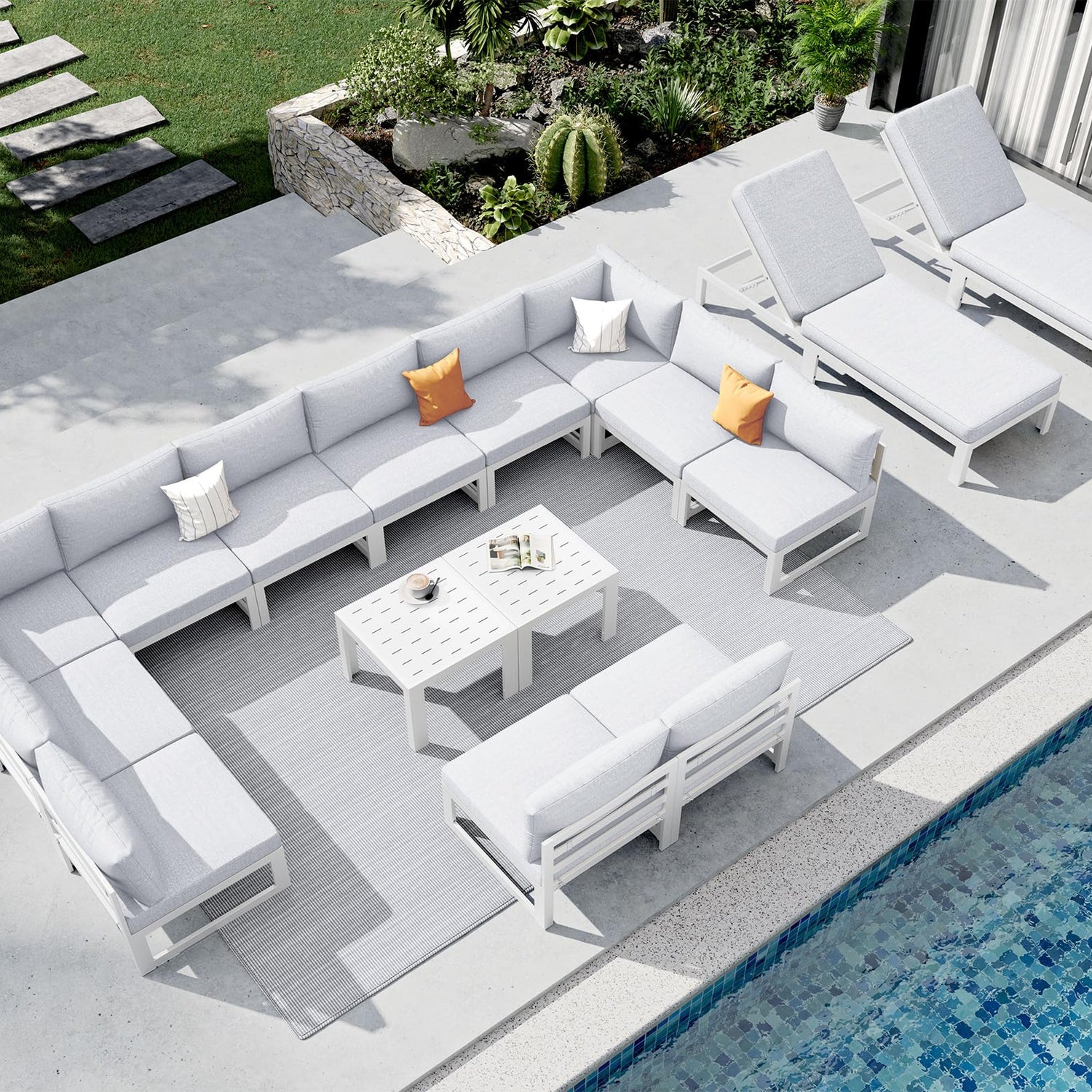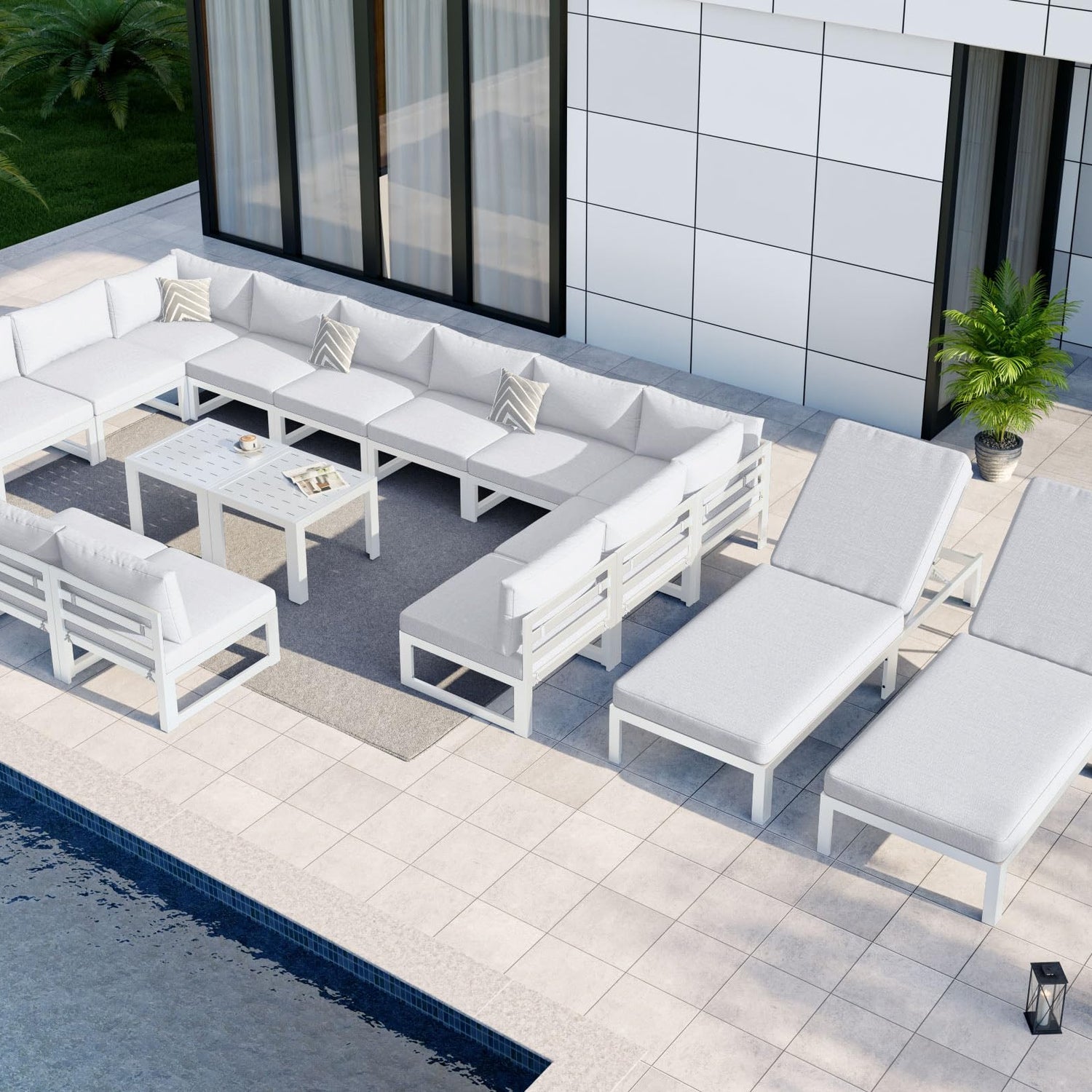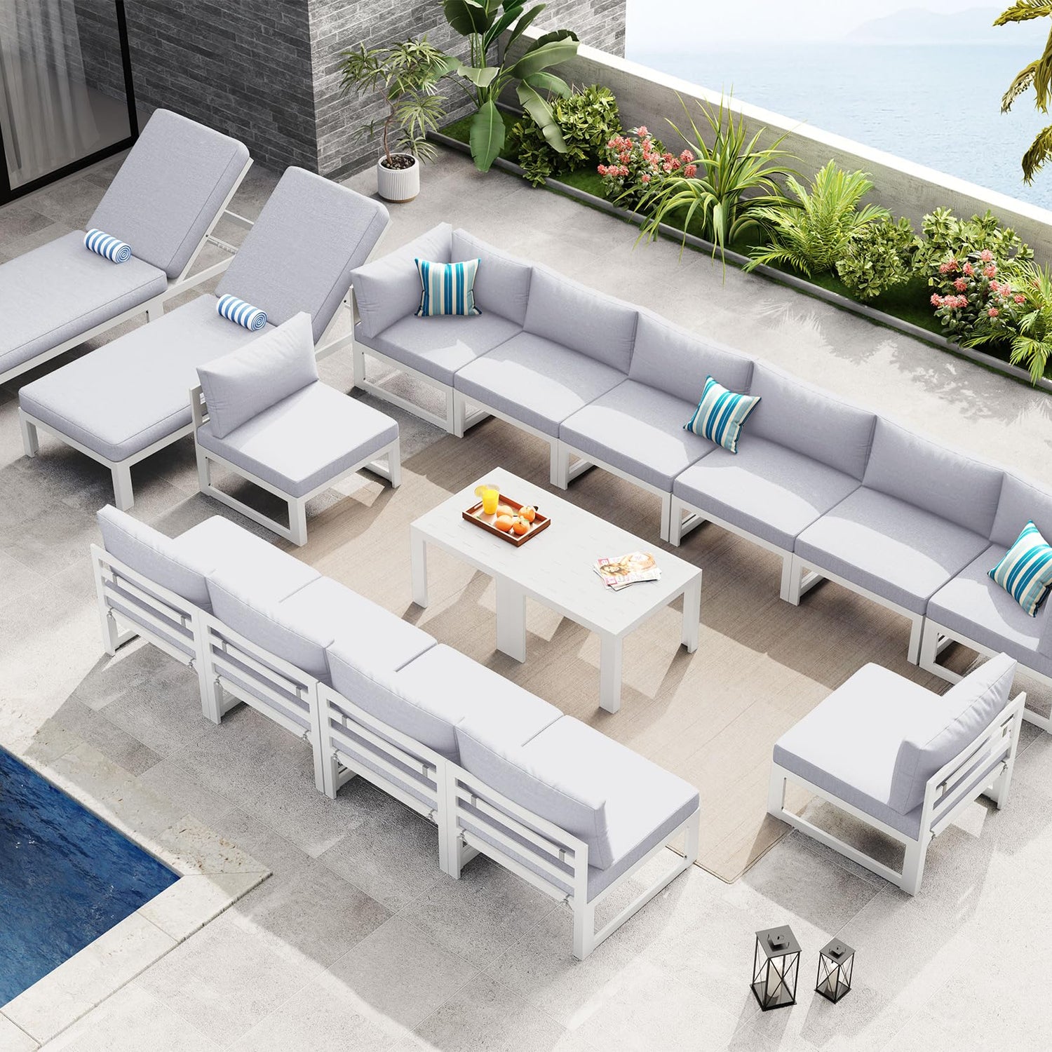 NICESOUL Extra Large Aluminum Patio Furniture Set with Chaise Lounge, All-Weather 29" Wide Seats Outdoor Sofa Conversation Set, 16 Piece Modern Sectional Couch for 14 Seats, for Garden, Light Gray
