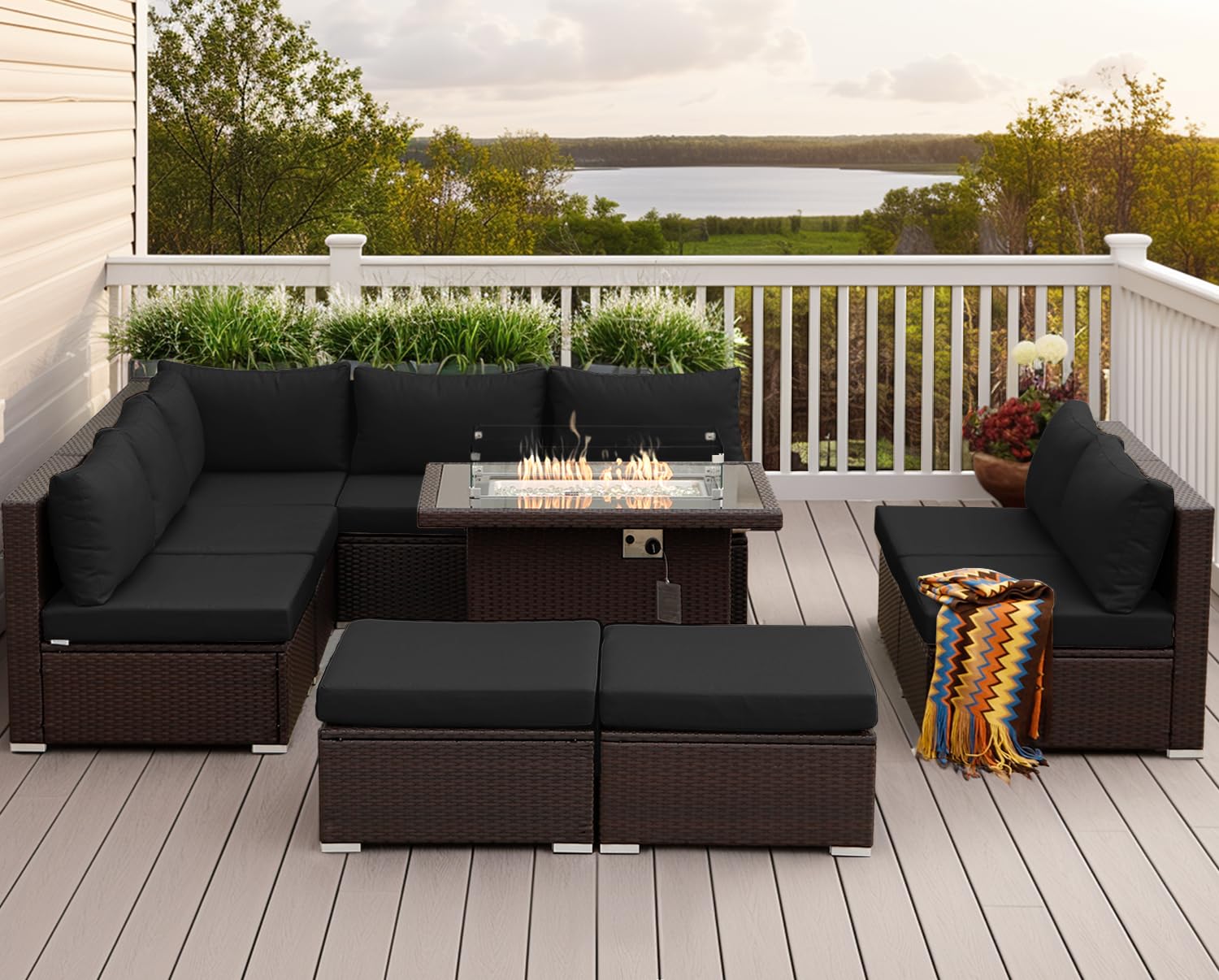 NICESOUL Outdoor Patio Furniture Set with Fire Pit Natural Gas/Propane, 29.3'' High-Back XL Large Conversations for Exteriors, 9-Seater Wide Deep Seating Rattan Sectional Sets, Brown and Black