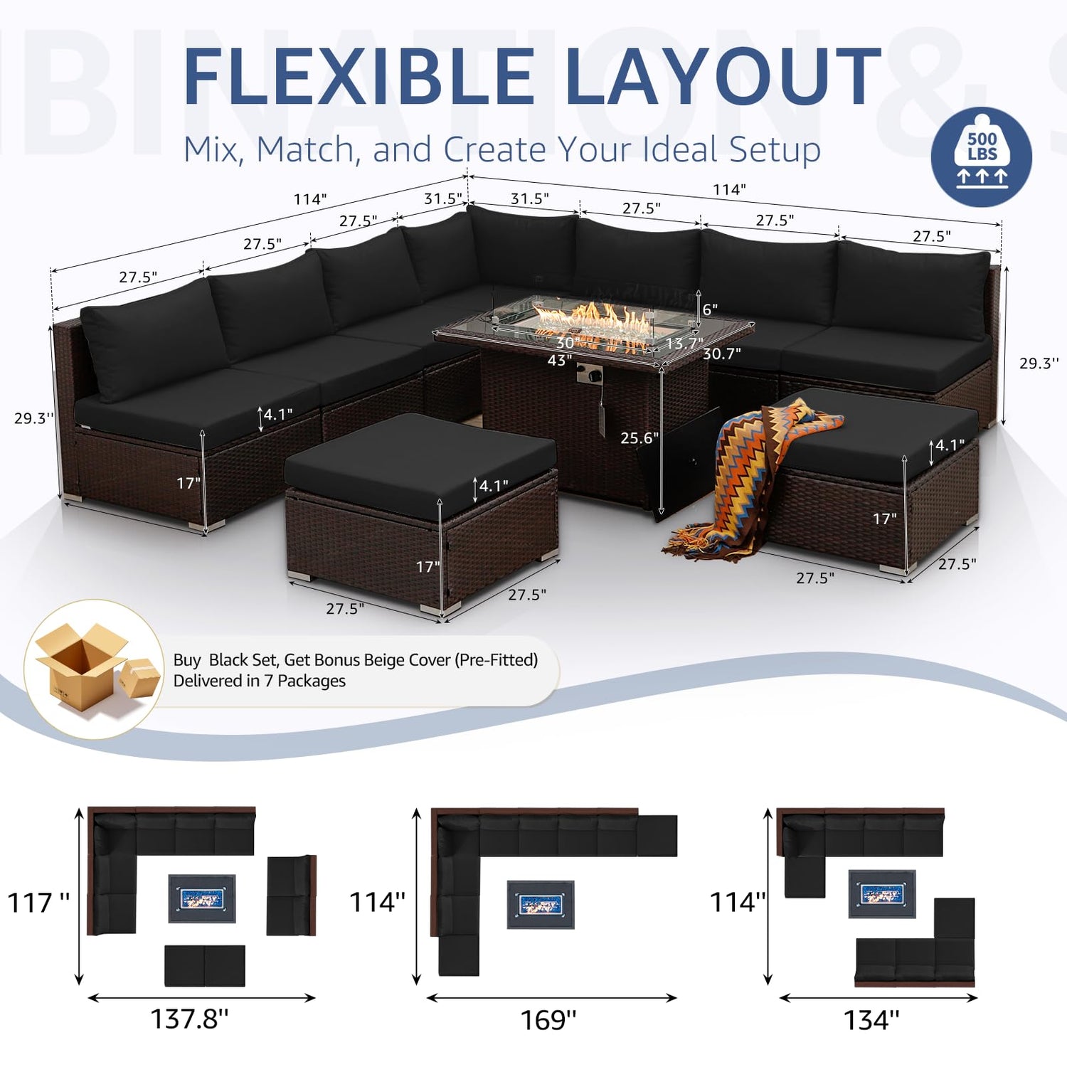 - SET INCLUDE: This elegant 10 Pcs modular luxury patio sofa set includes one fire pit table, one orner chair, six middle chairs, two ottomans, and a separate package of black cushion covers; The cushion covers are designed with removable zipper for easy changing, along with the beige sofa covers originally installed on your couch, you'll get two different colors to match as you outdoor decoration