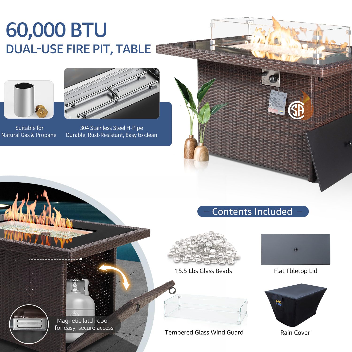 - DUAL-FUEL FIRE PIT TABLE: The whole fireplace holding a CSA certification ensures a safe use; Equally suitable for natural gas and propane, a conversion accessory kit is provided; Built with full anti-rust powder-coated steel frame, offering remarkable sturdiness and longevity; The large 304 stainless steel pan and H-pipes burner provides 60,000 BTU heat output and ample warmth, 8mm tempered glass tabletop, equipped with an Ignition device and electronic switch control for easy adjustment of flame