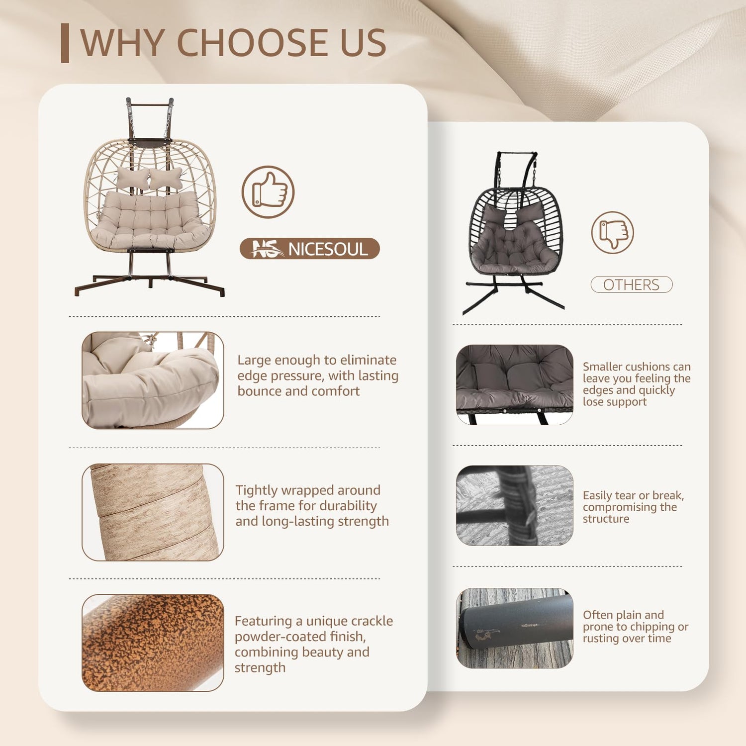 NICESOUL Oversized 2 Person Double Egg Chair Indoor Outdoor, Wide Large Swing Chair with Stand, All-Weather Patio Hanging Egg Hammock Seating, 700lbs Sturdy Porch Swings for Backyard, Cream with Cover