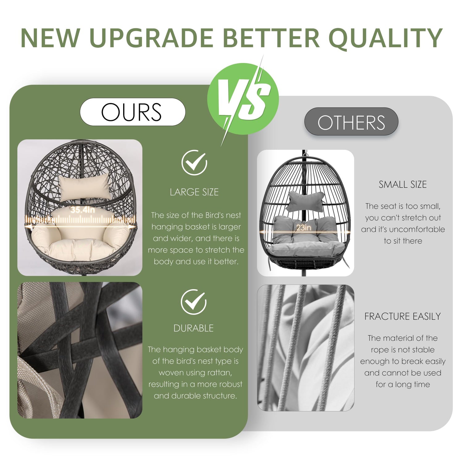 NICESOUL Oversized Patio Swing Egg Chair, Cozy Bird Cage Hanging Basket Chairs with Stand, Indoor Outdoor Large Rattan Swinging Chair, 450 lbs Sturdy Egg-Shape Padded Seat for Balcony Outside, Beige