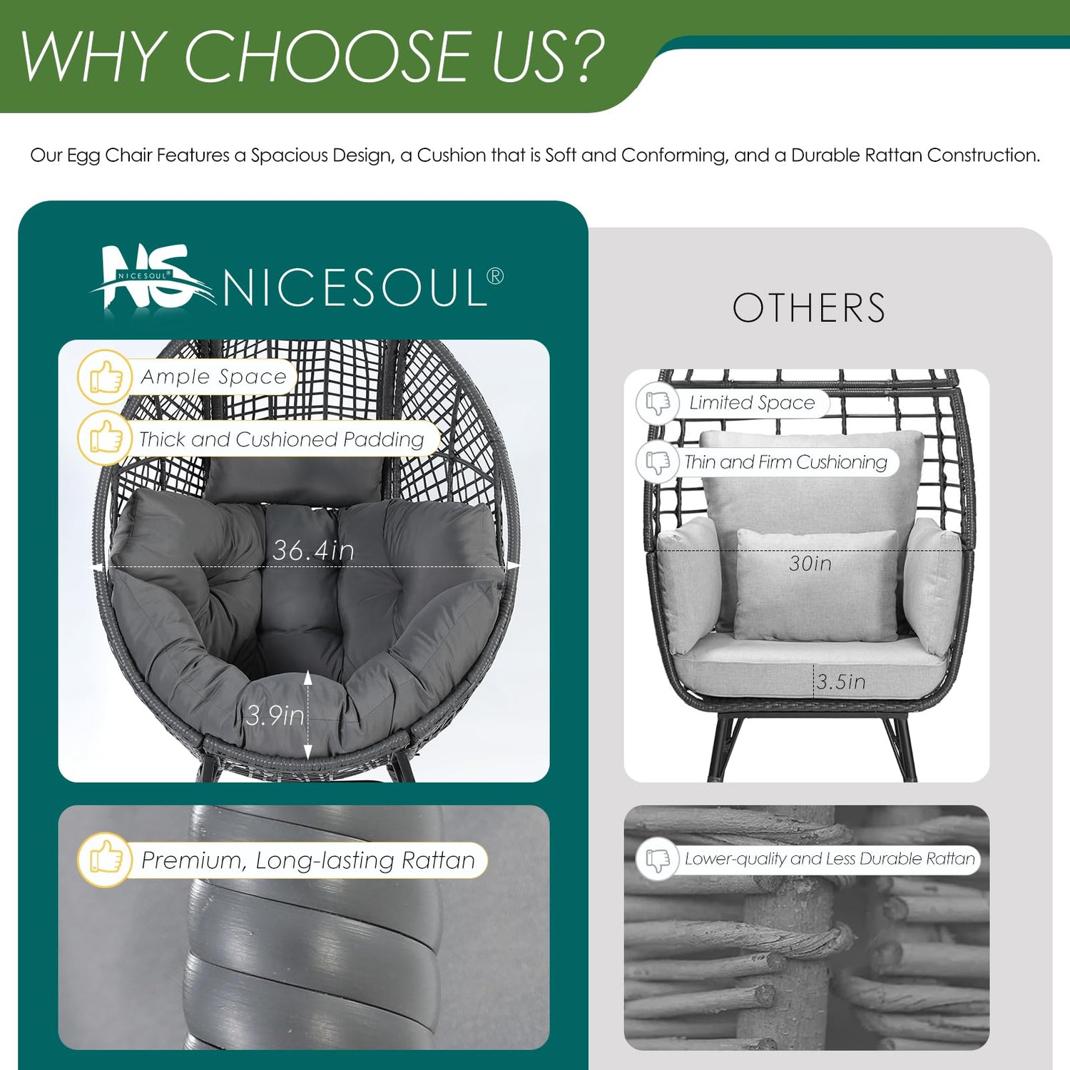 - EXTRA LARGE EGG CHAIR: Experience the ultimate comfort in our upgraded extra large wicker egg chair; with its spacious design and widened opening, taller individuals will have plenty of headroom;the generously sized seat allows you to curl up and enjoy your favorite book or relax