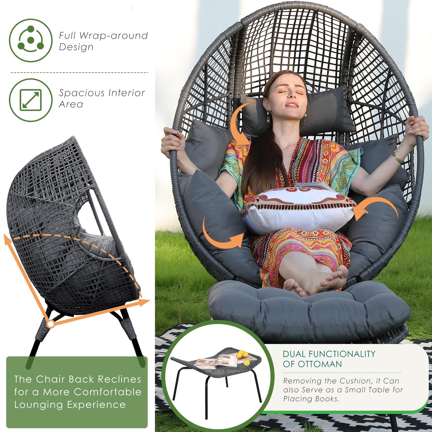 NICESOUL Patio Egg Chair with Ottoman, Indoor Outdoor Egg-Shell Lounge Chair, Cozy Oversized Round Circle Chair, 440lbs Boho Rattan Egg-Shaped Papasan w/Cushion for Living Room, Exterior, Porch, Gray