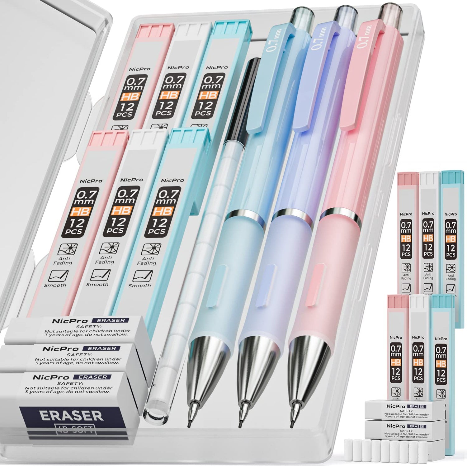 Nicpro 3PCS Pastel Mechanical Pencil Set with Case, 0.7 mm Pencils with 6 Tube HB Lead Refill, 3PCS Eraser, 9PCS Eraser Refill for School Supplies Student Writing, Drafting Drawing Sketching