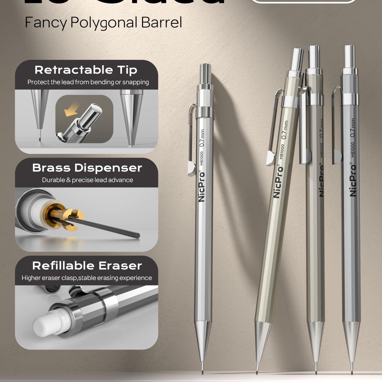 - 【Nicpro MB1000 Mechanical Pencil Set】Come With 4 PCS 0.7 mm mechanical drafting pencils ,in 4 elegant metallic color, 8 tubes of HB lead refill 0.7 mm(60pcs/tube), 9pcs of cap eraser refills, 3pcs soft 4B erasers and a sturdy mechanical pencil case