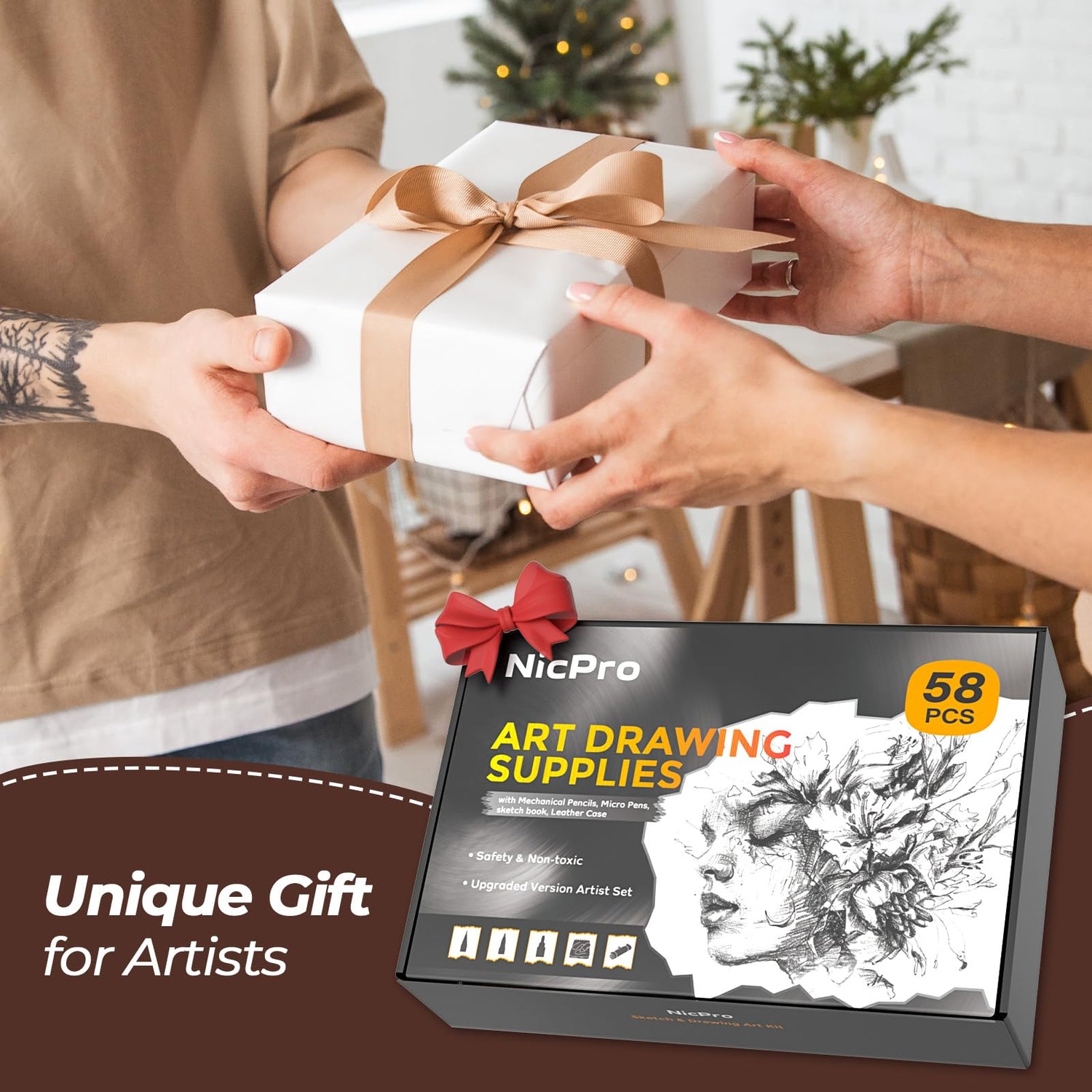 Nicpro 58 PCS Art Drawing Supplies Kit in Leather Case, Art Mechanical Pencil Set with 6 Metal Drafting Pencil 0.5 & 0.7 & 0.9 & 2mm, 12 Micron Pen, Sketch Book, 30 Tube Lead Refills for Sketching