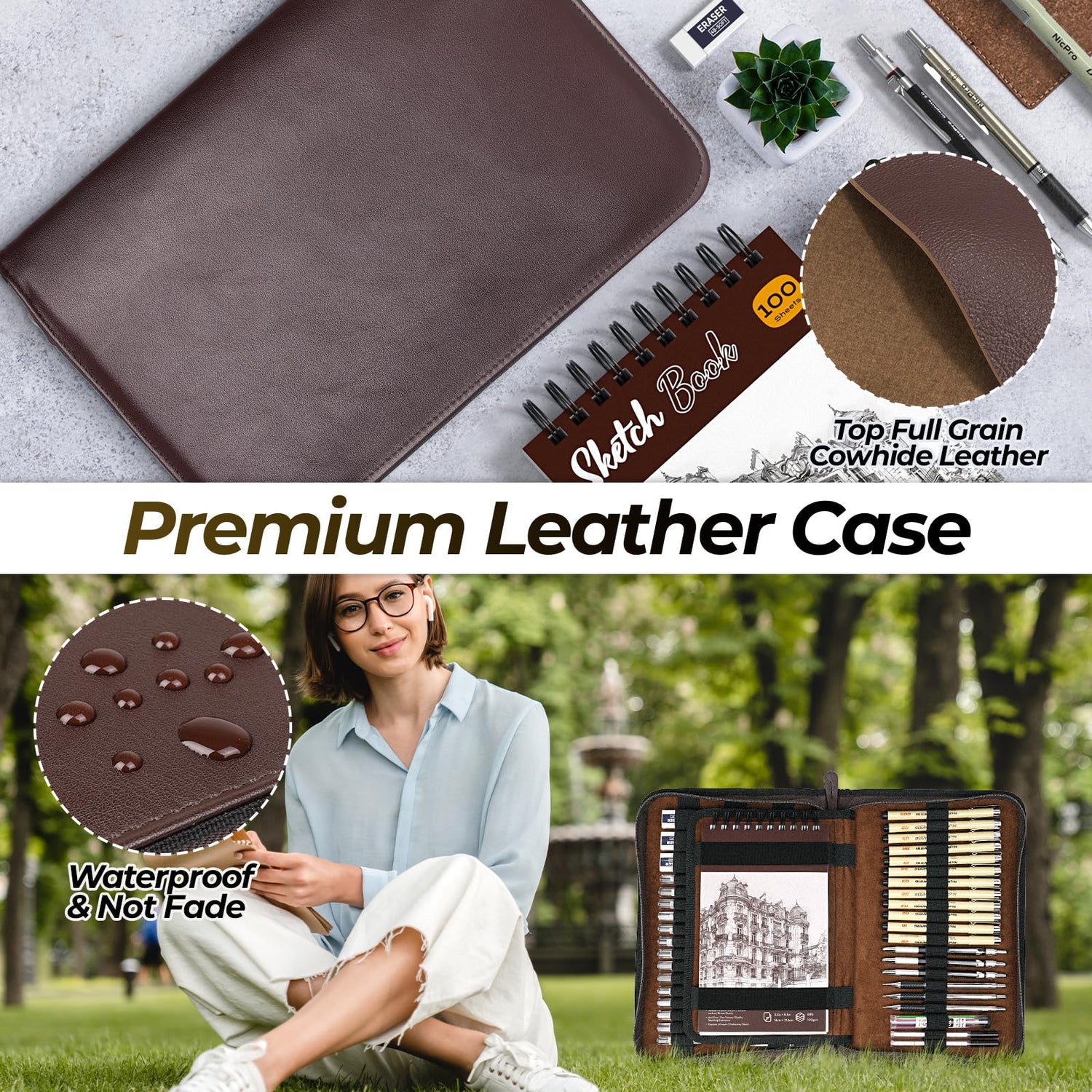 - Portable Leather Pencil Case and Perfect Gift: All sketching supplies in a premium top grain leather case, the interior of the leather pouch is made from velvet lining, soft feeling yet tough with a wonderful leather aroma. When you take this art set out to sketch, not only is it easy to carry around, but also provides perfect protection for your drawing tools! In addition, beautifully packaged in a gift box is the best gift for advanced artist, adults, teenagers, beginners, kids, art students, hobbyists on Christmas, Thanksgiving, Birthday, Graduation and Easter Day