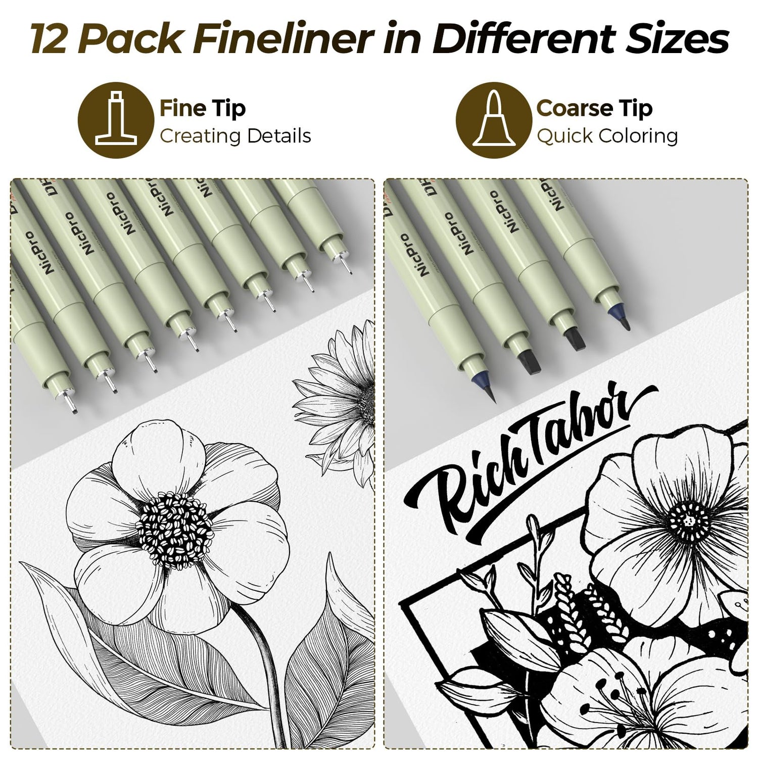 - 12 Black Micron Drawing Pens: The drawing pen set contains 12pcs assorted types of micron pens, Line width & cap size: 0.2mm (005), 0.25mm (01), 0.3mm (02), 0.35mm (03), 0.40mm (04), 0.45mm (05), 0.50mm (08), 0.55mm (1.0), 1.0mm (1), 2.0mm (2), 3.0mm (3), Brush (BR). No Bleed, No Smear and Waterproof. Perfect for artists and designers drawing, writing. Whether you are an artist or a beginner, you can easily use it