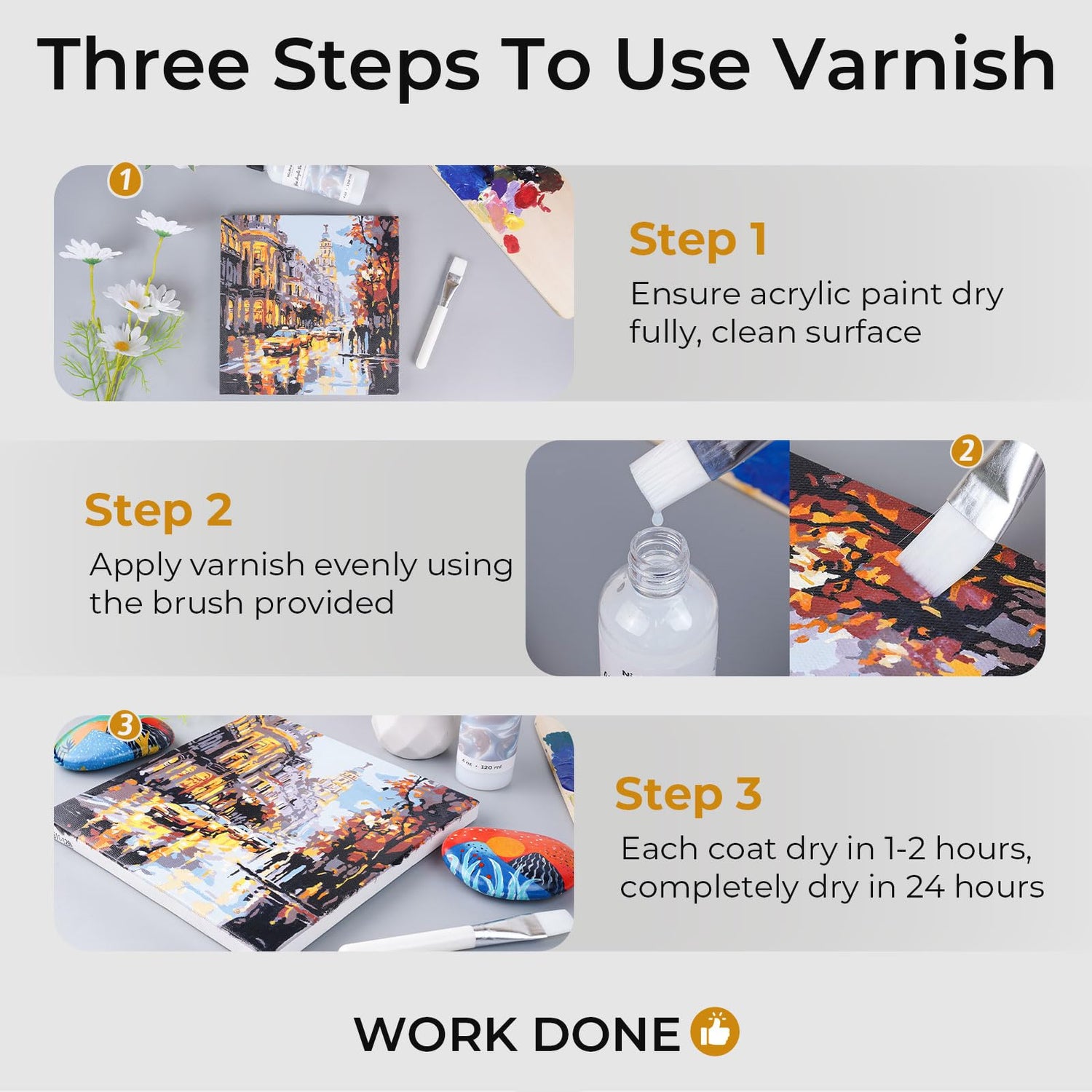 - EASY TO USE: Our acrylic protective varnish comes with a soft brush for easy application. Use the brush to apply the varnish in even strokes, applying 2-3 thin coats (each coat takes 1-2 hours to dry), and finally leave the painting flat to dry for 24 hours.