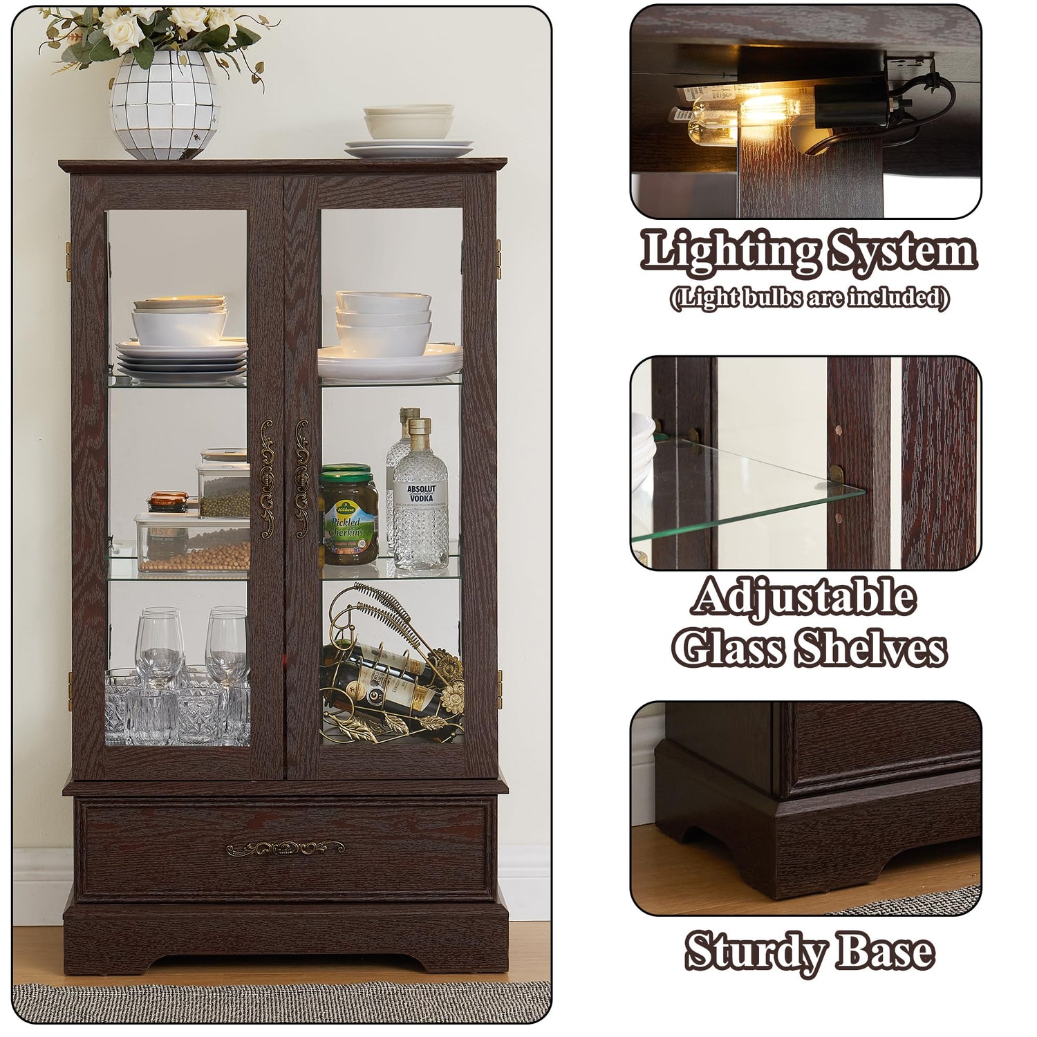 - 【3-Tier Lighted Glass Display Curio Cabinet with 1 Drawer】The illuminated curio cabinet elegantly showcases your exquisite possessions, adding a touch of sophistication to your home.Crafted with adjustable shelves, a big drawer and metal handles, this cabinet exudes a touch of classical beauty and vintage charm.The mirrored back panel runs the entire height of the curio cabinet and ensures your family heirlooms will be in the best view at all times.Having the mirrored back panel ensures you'll get a pleasing view of your collectables from anywhere in the room.Perfectly sized for any room in your household, this piece is sure to elevate the ambiance and aesthetic appeal of your living space.