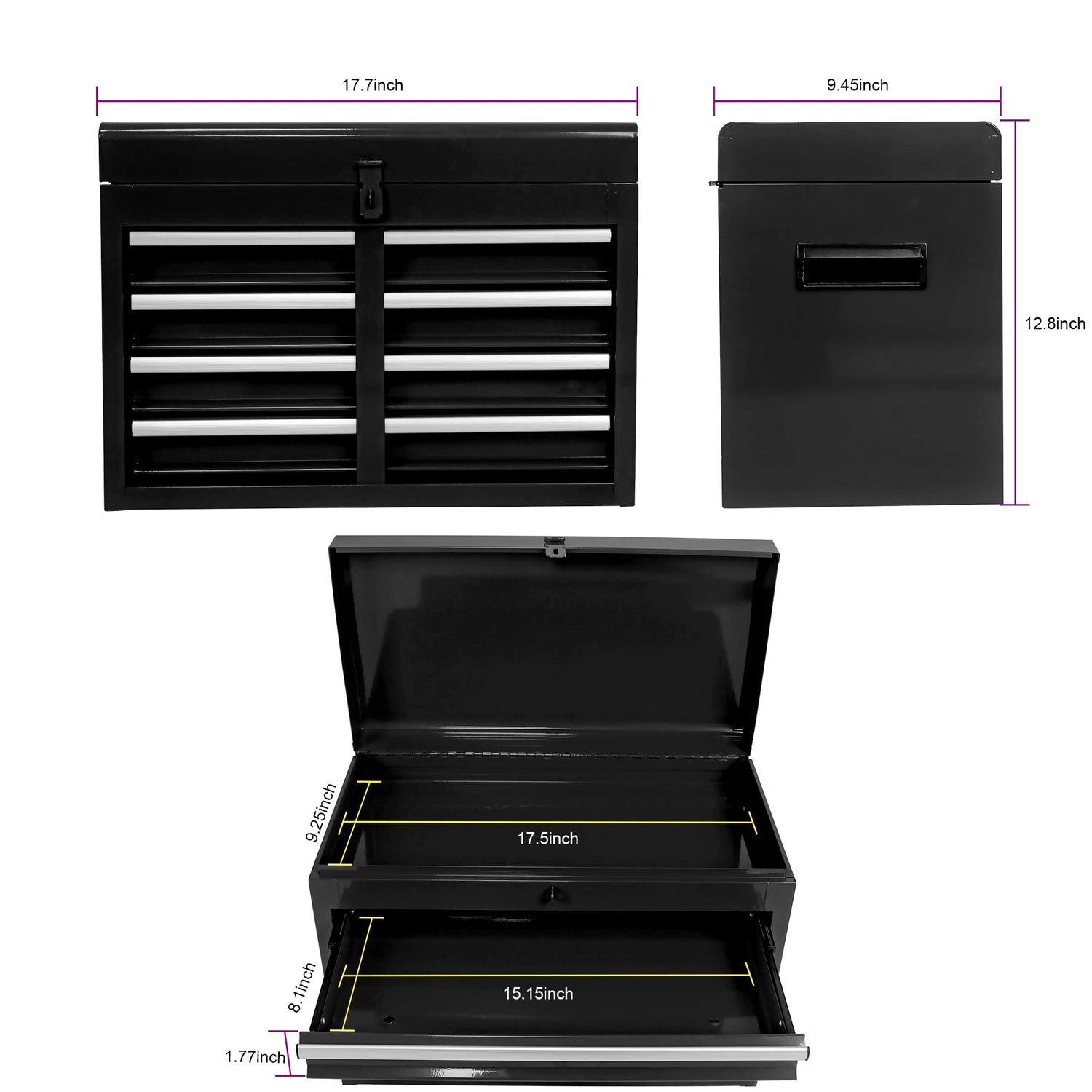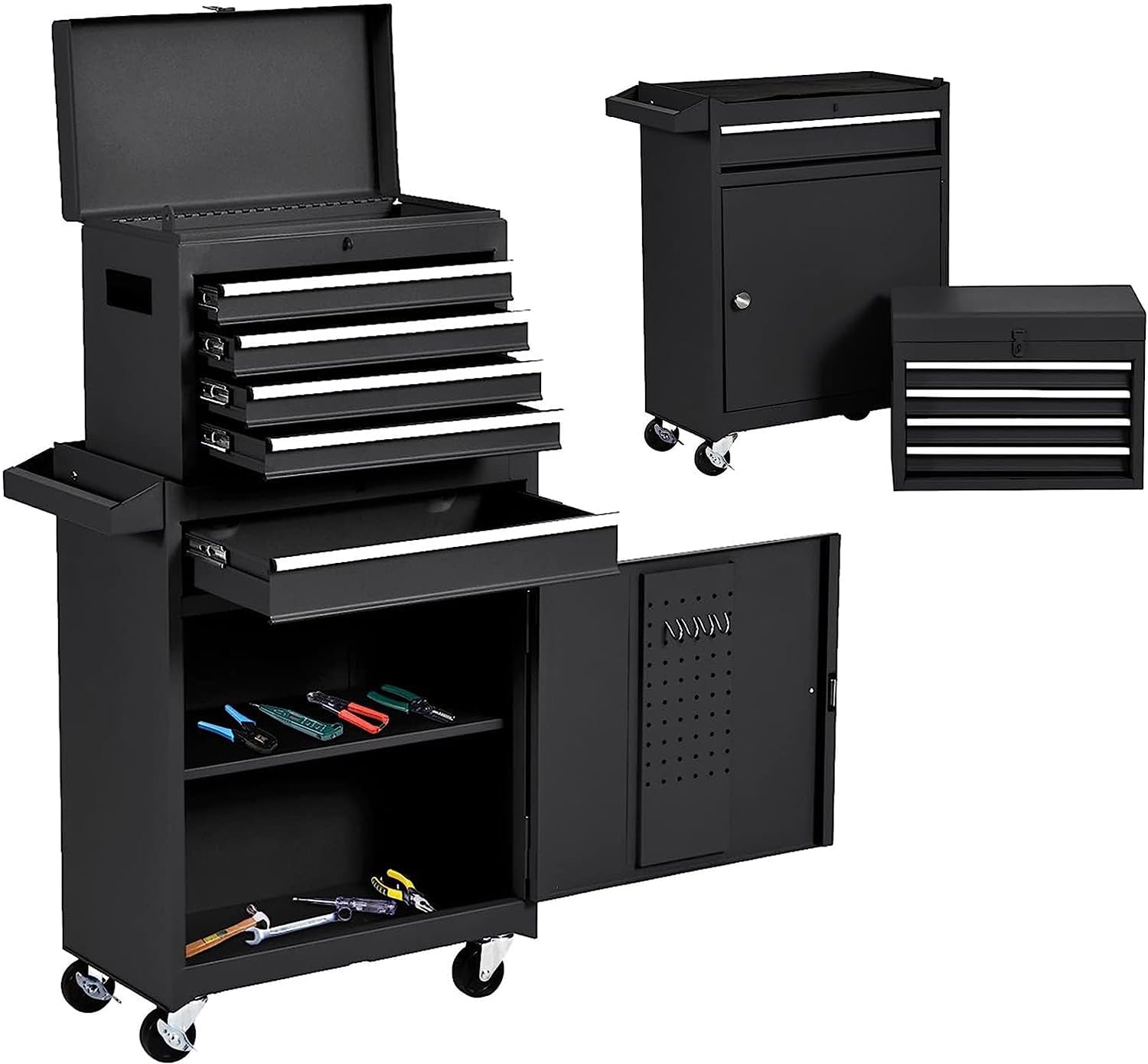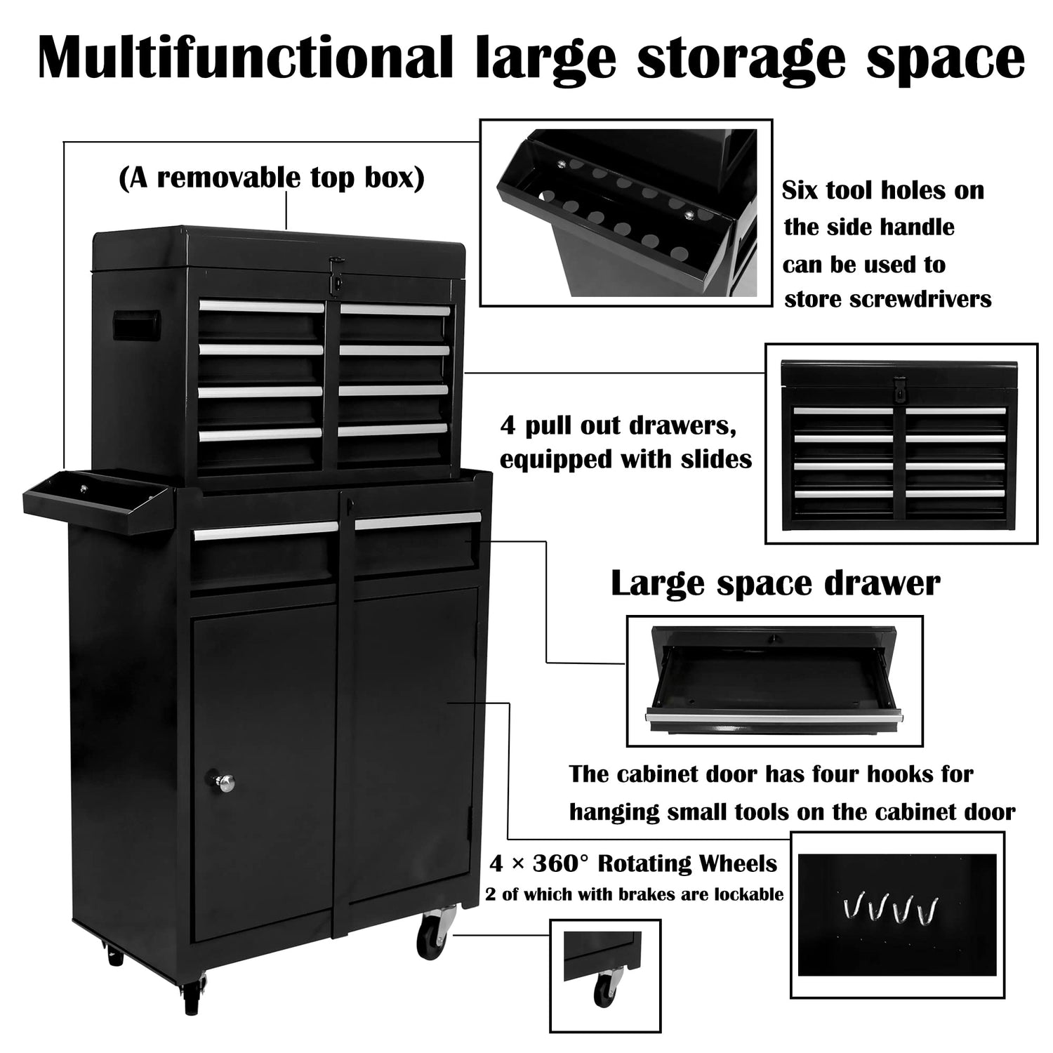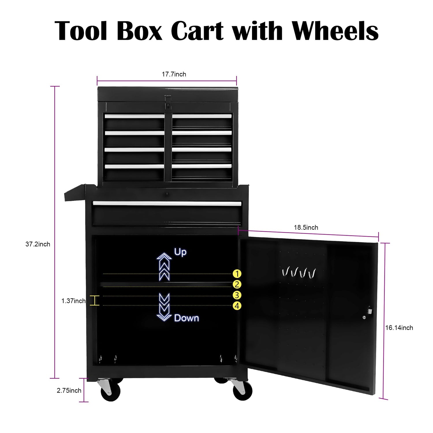 - 【Large Storage Space】Size:22.95"W x 11"D x 47.25"H.This drawer tool box comes with a removable top box, and the top tool box has 4 pull-out drawers, equipped with slides for easy operation. The bottom storage cabinet has 1 pull-out drawer and 1 adjustable shelf. The cabinet door has four hooks for hanging small tools on the cabinet door. Six tool holes on the side handle can be used to store screwdrivers.