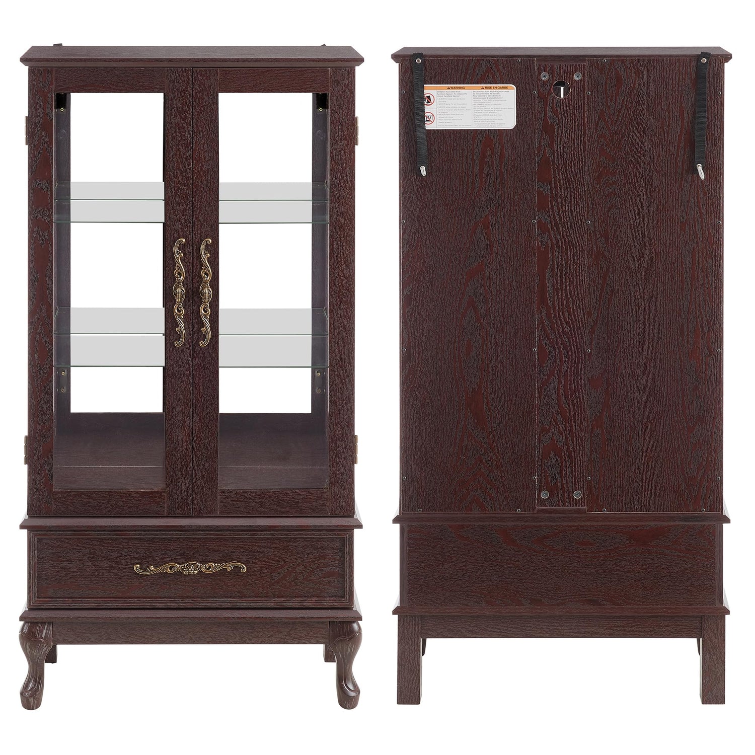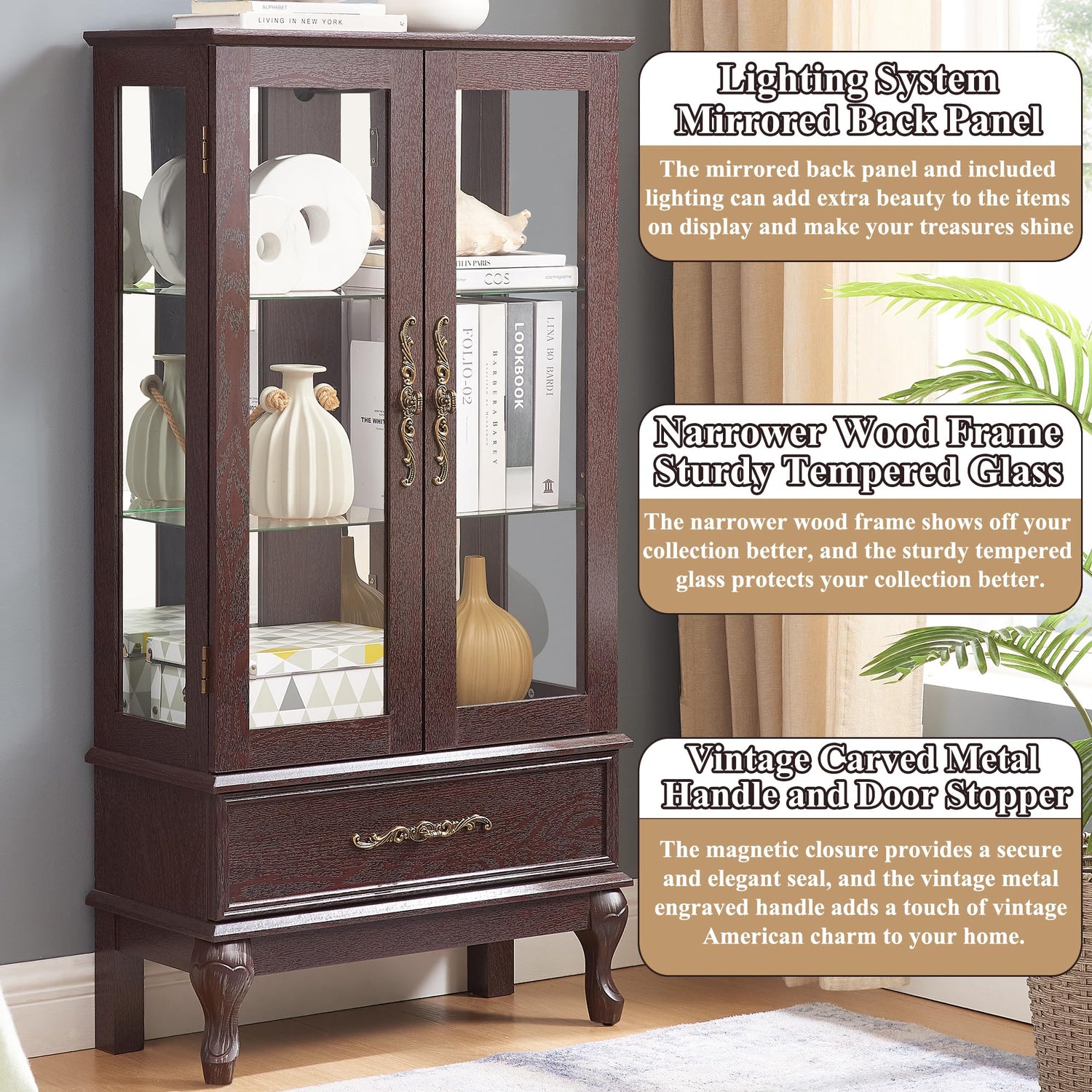 - 【3-Tier Lighted Glass Display Curio Cabinet with 1 Drawer】The illuminated curio cabinet elegantly showcases your exquisite possessions, adding a touch of sophistication to your home. Crafted with curved legs,adjustable shelves, a big drawer and metal handles, this cabinet exudes a touch of classical beauty and vintage charm. The mirrored back panel runs the entire height of the curio cabinet and ensures your family heirlooms will be in the best view at all times. Having the mirrored back panel ensures you'll get a pleasing view of your collectables from anywhere in the room.