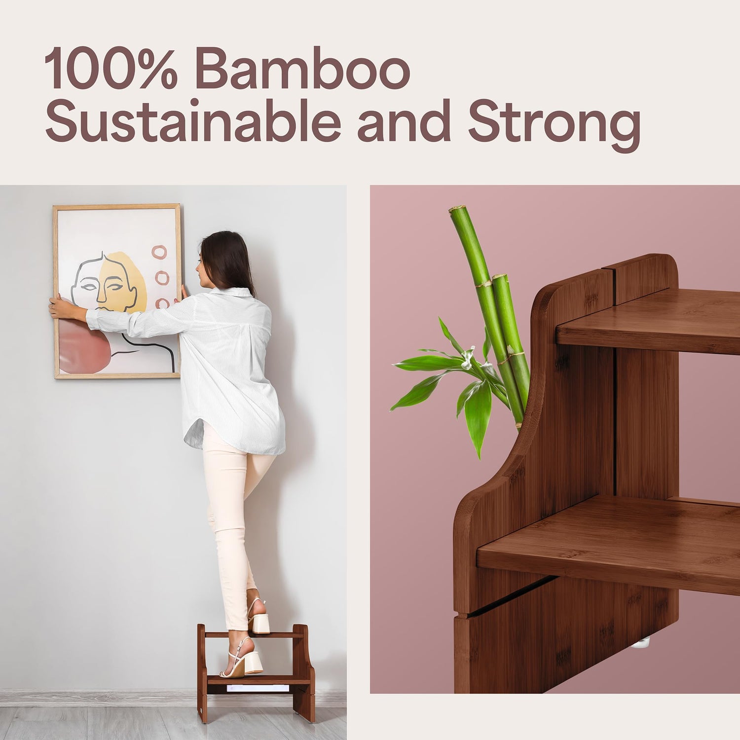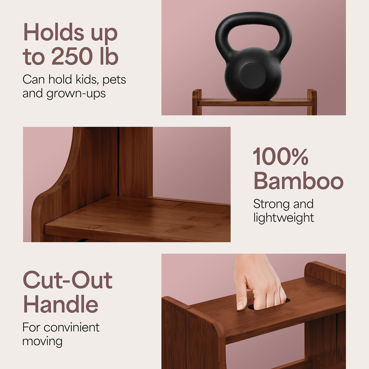 - SUSTAINABLE AND SMARTLY DESIGNED. This stool for kids is made of bamboo, which is eco-friendly, smooth, lightweight, and easy to clean (with just a wet cloth). The cut-out handle helps move the two step stool conveniently. And the recessed step saves space in the room.
