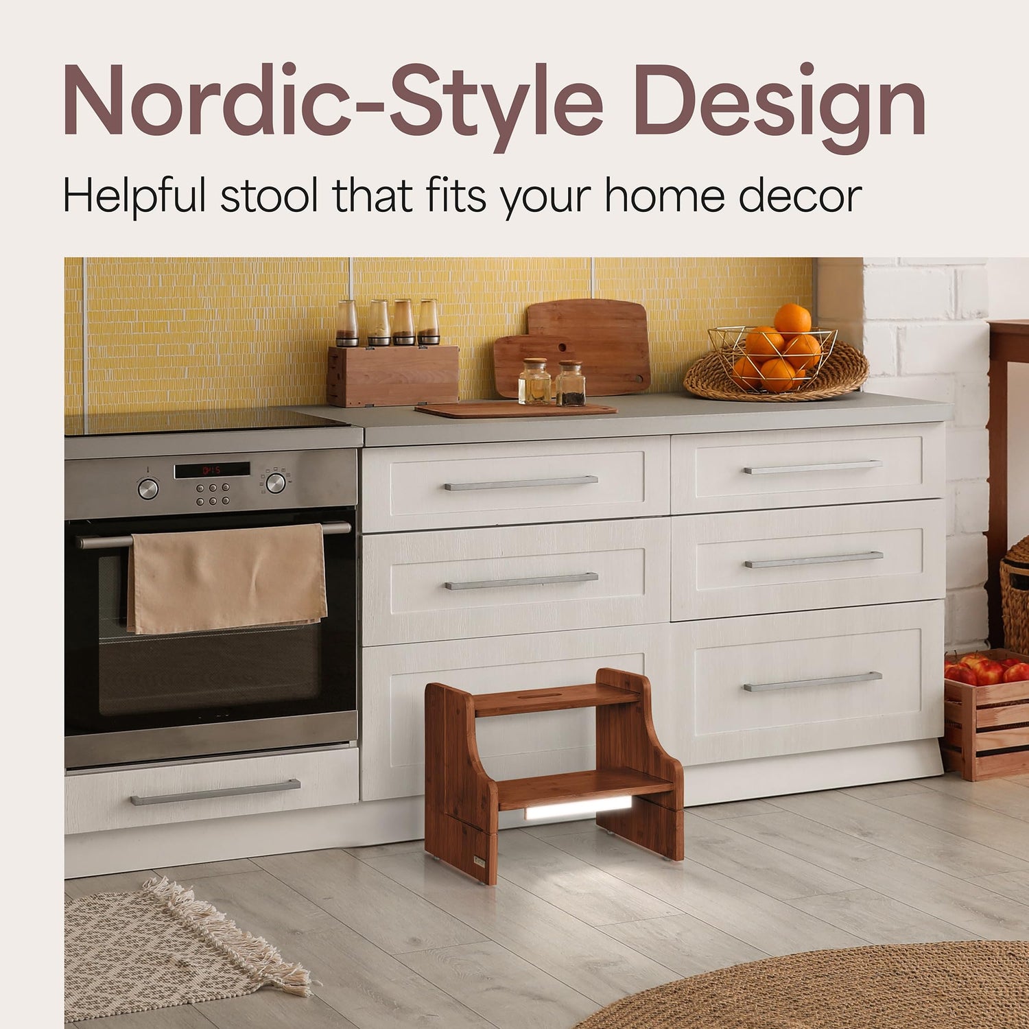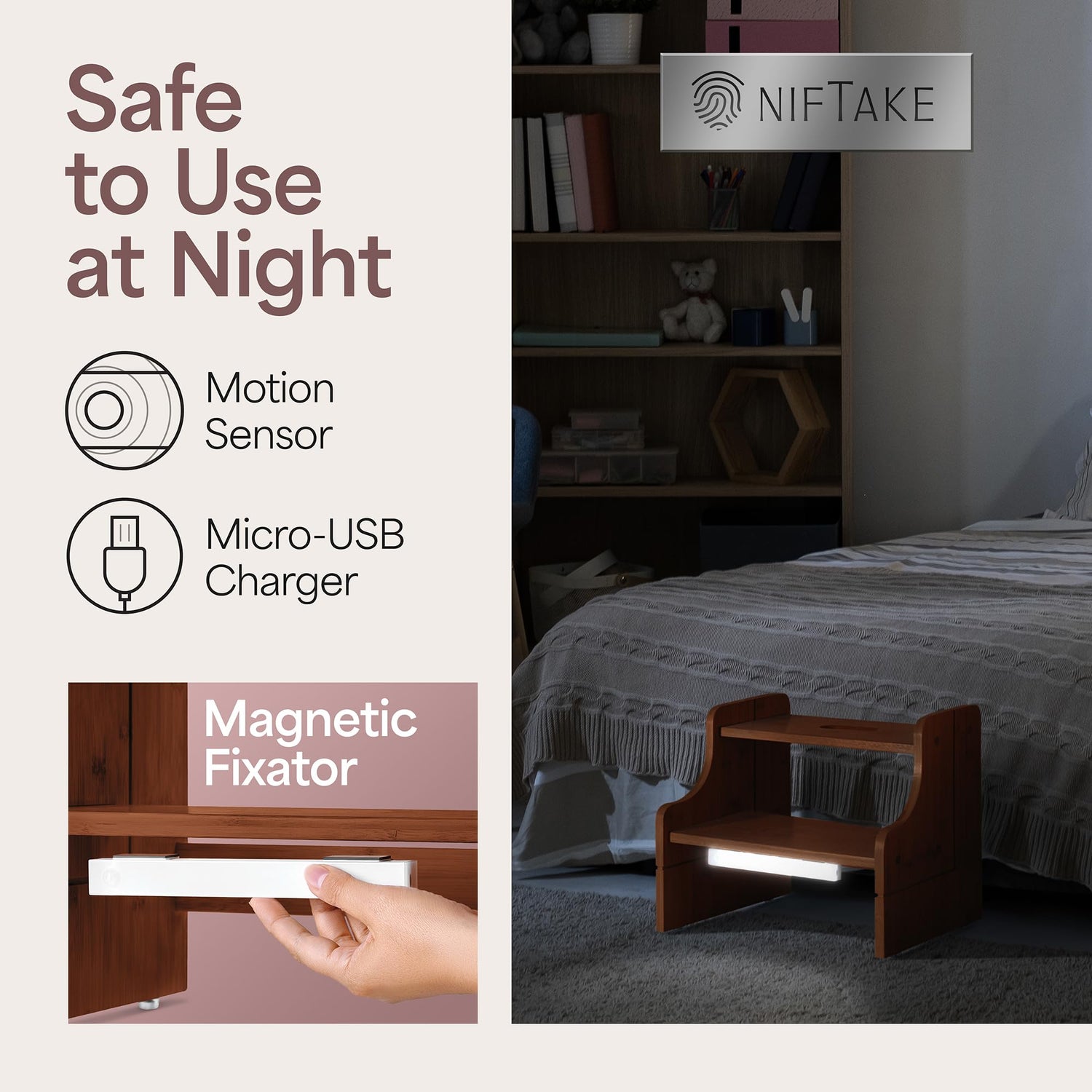 NIFTAKE Kids Step Stool, 250lb Capacity - Safe, Durable, Bamboo Step Stool Kids, Wooden Step Stool for Toddlers, Toddler Step Stool for Bathroom sink, Kids Stool, Toddler Stool-with Auto Light (Brown)
