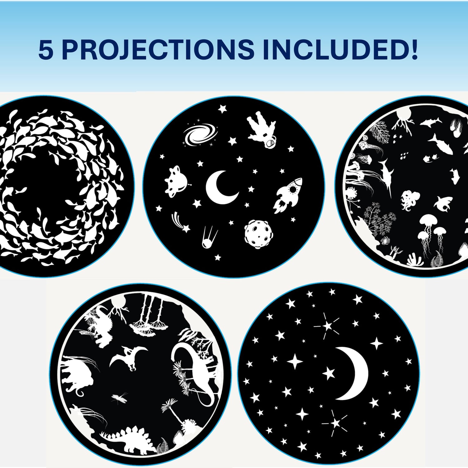 - Includes 5 different light projections: Put yourself in the middle of a herd of dinosaurs, watch schools of fish swim around your room, gaze up at the moon and stars across your ceiling, enjoy an undersea landscape, and watch spaceships and astronauts orbit your room.