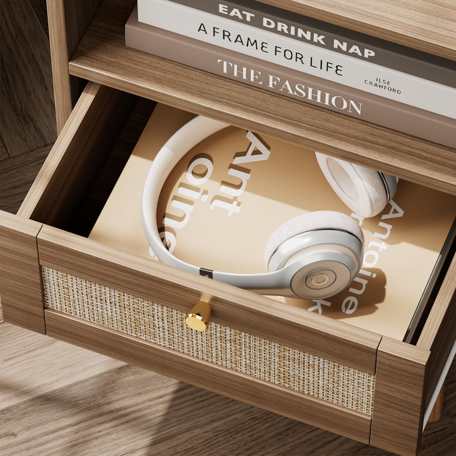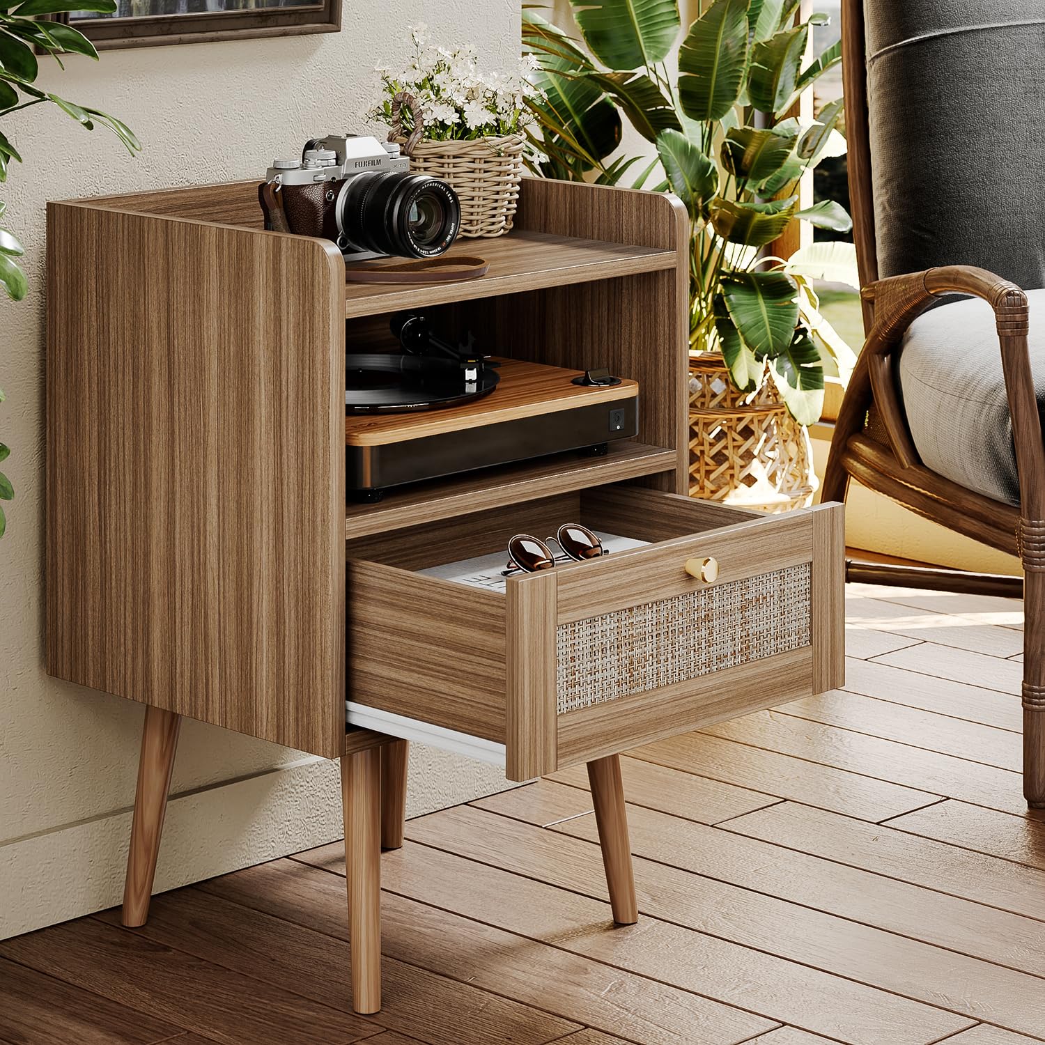 - Modern & Minimalist Aesthetic: Embracing PE oak texture and sleek lines, this bedside table complements a minimalist lifestyle. The rattan weaving detail on the drawer adds a touch of elegance and warmth, making it a perfect fit for both the living room and bedroom, bringing brightness and a rustic charm to the space.
