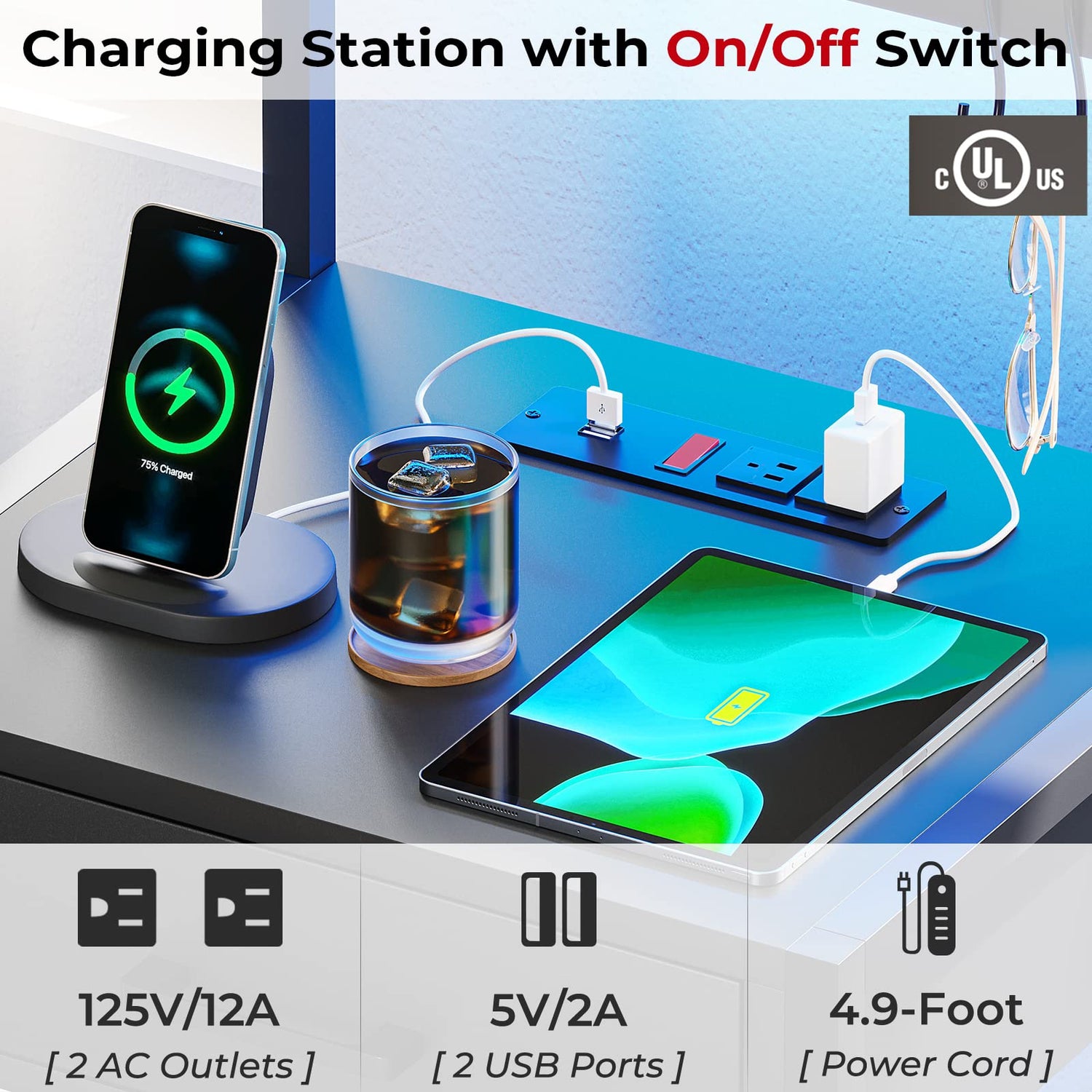 Nightstand with Charging Station and LED Lights, LED Night Stand with 2 USB Ports and 2 AC Outlets, Modern End Table with 3 Drawers, Bedside Table with Open Storage for Bedroom, Black