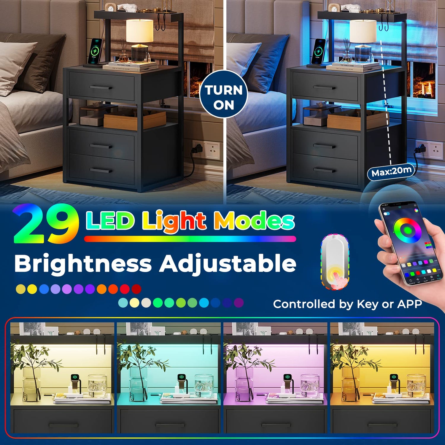- 【LED Light with multi-variable RGB colors】The bedside nightstand comes with beautiful Multi-colour RGB LED Light, Phone App + Key multiple control modes. You can freely set the color, brightness, music mode and timing function, and design your light show according to needs and scenes. The colorful lighting design of the side table brings a warm and stylish dreamy atmosphere to decorating your bedroom or living room.