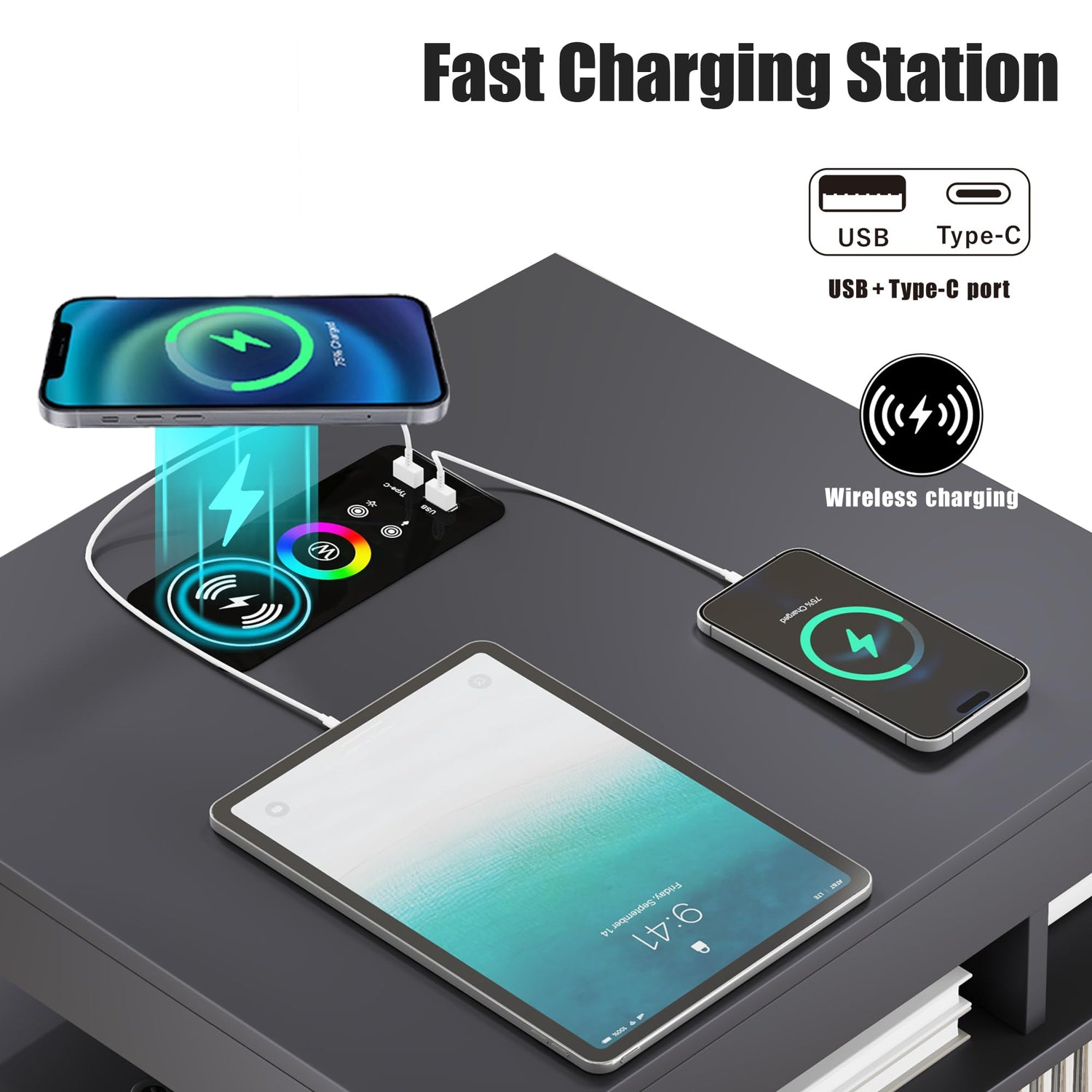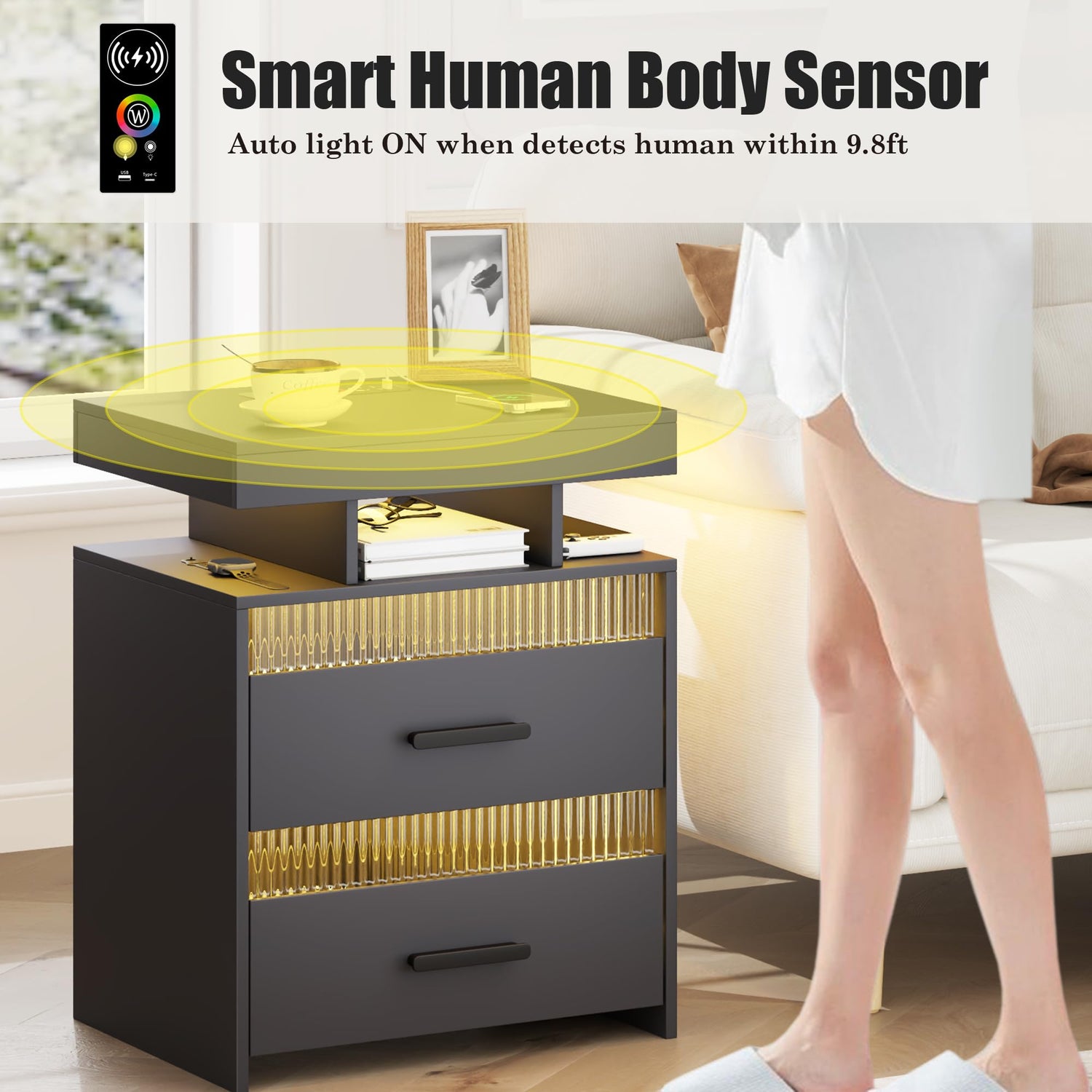 - Smart LED Nightstand: The bed side table is designed with human sensor RGB led light, lights up by itself when detect human approach within 9.8ft. you can switch 20 colors and brightness by manual control panel